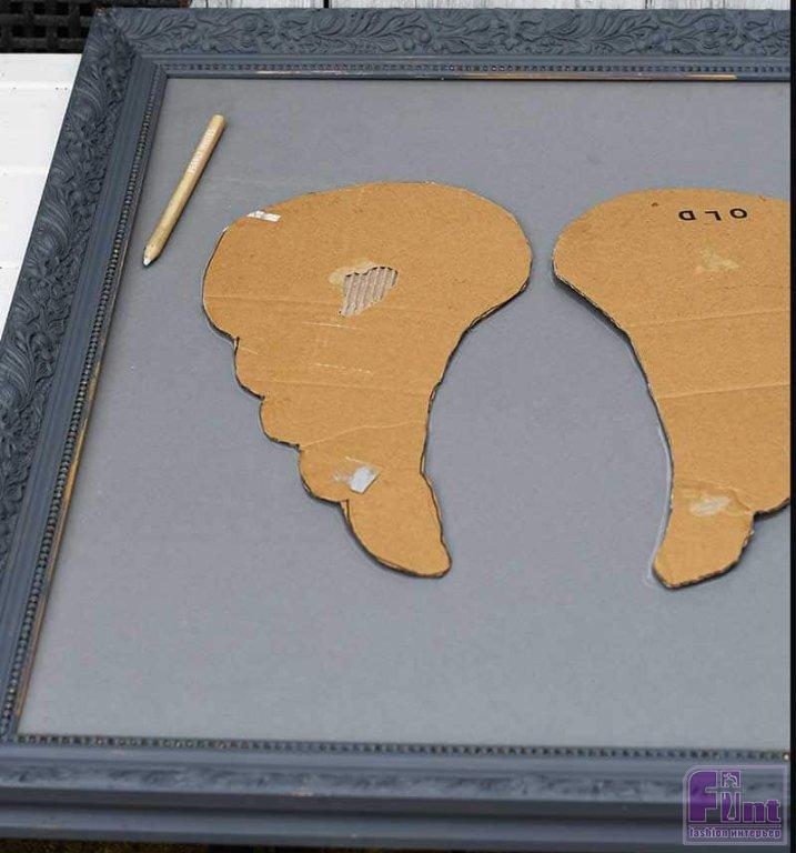 Пока наши шишки сохнут, займёмся крыльями ангела. Скачайте из интернета подходящий шаблон, или нарисуйте свои собственные крылья ангела на картоне. Вырежьте шаблон, положите его по центру вашей фоторамки и обведите белым карандашом.
