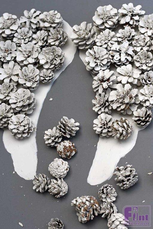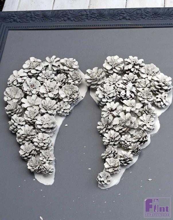 Соберите все высохшие шишки и начните укладывать их на крылья ангела.Попробуйте несколько вариантов укладки, чередуя более крупные шишки с более мелкими. Мы укладывали более крупные шишки вверху крыльев, постепенно уменьшая размер шишек к нижним кончикам нарисованных крыльев ангела.