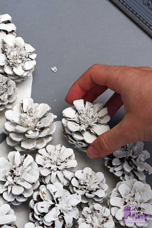 Когда вы будете полностью удовлетворены расположением сосновых шишек, приклейте их к основанию фоторамки с помощью горячего клеевого пистолета.Приклеивайте шишки одну за другой, постепенно заполняя нарисованные крылья шишками.