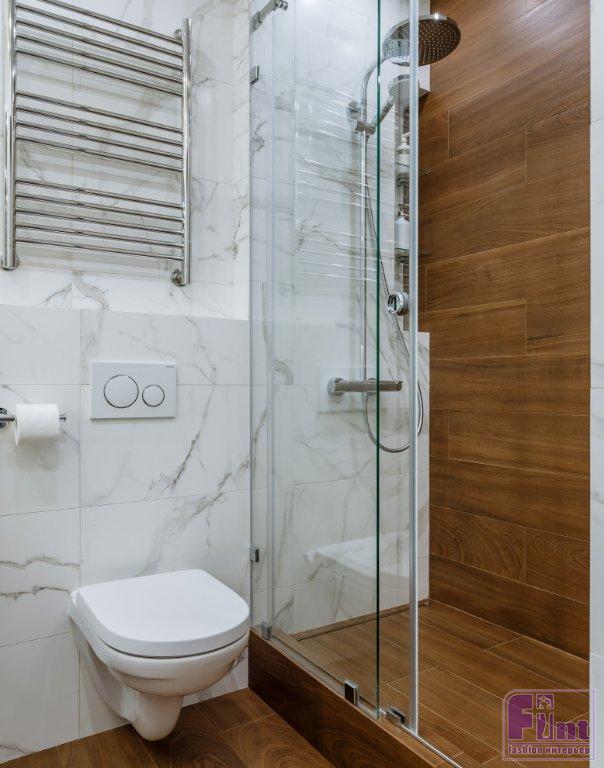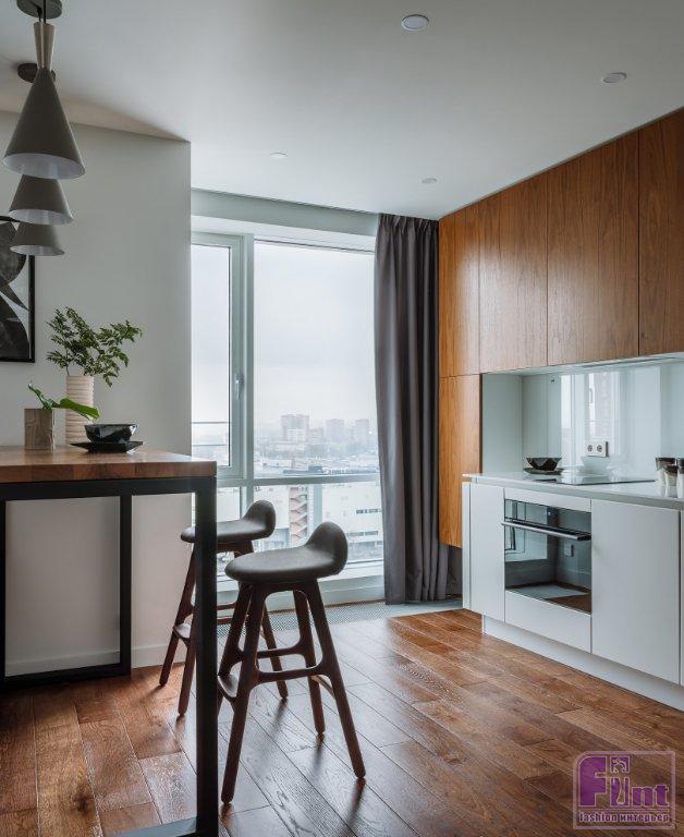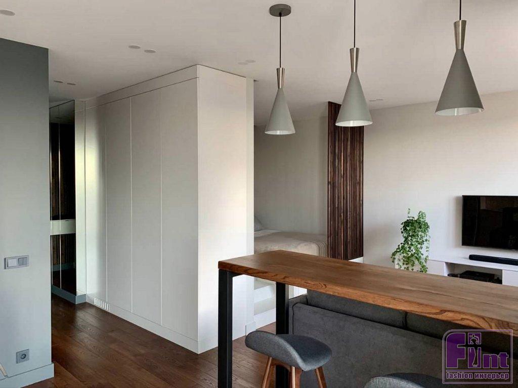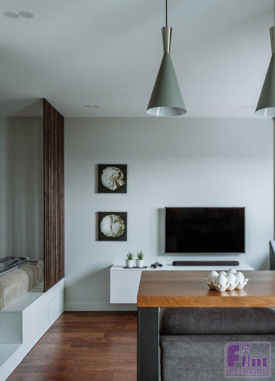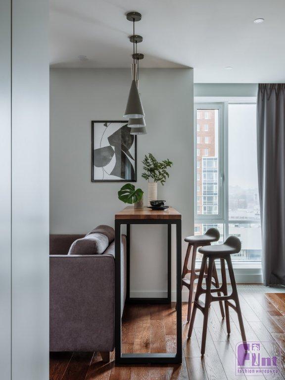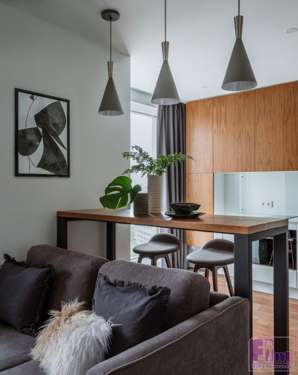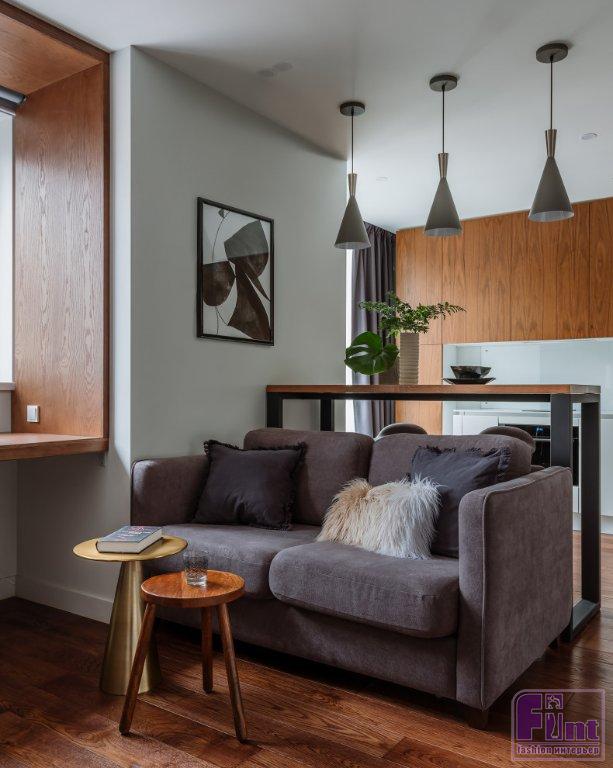 Кухню и гостиную зонировали с помощью барной стойки и дивана. В цвет инженерной доски на полу подобрали фасады верхних полок на кухне, откосы для окна и керамогранит в санузле. Над барной стойкой в минималистском стиле дизайнер разместила три модных потолочных светильника авангардистской конусообразной формы. Они обеспечивают локальное уютное освещение зоны приёма пищи и дают необходимый свет в зону отдыха, где установлен диван напротив телевизионной панели.