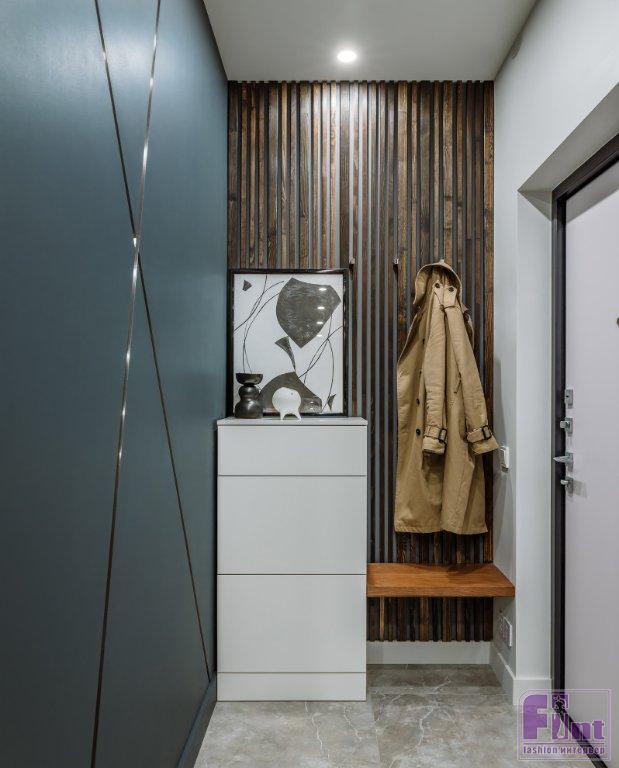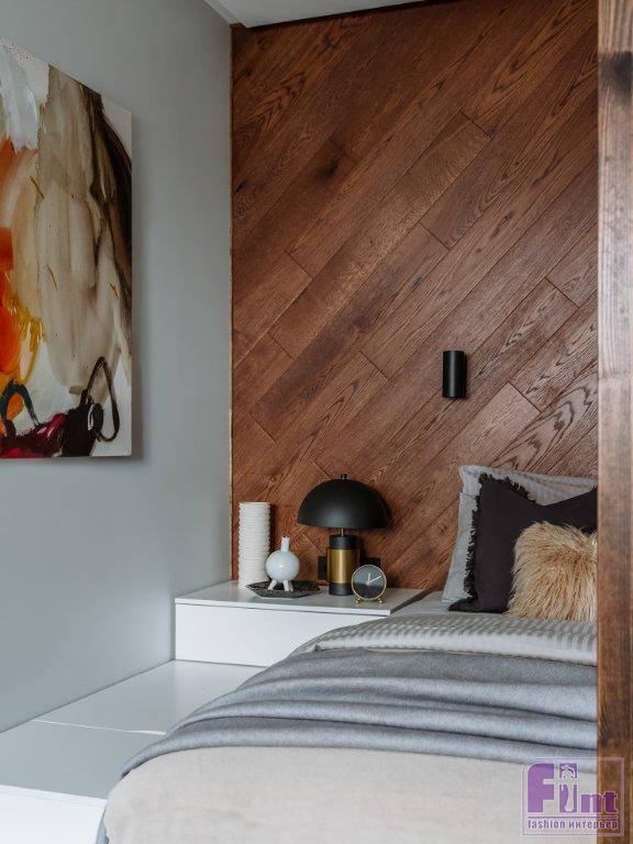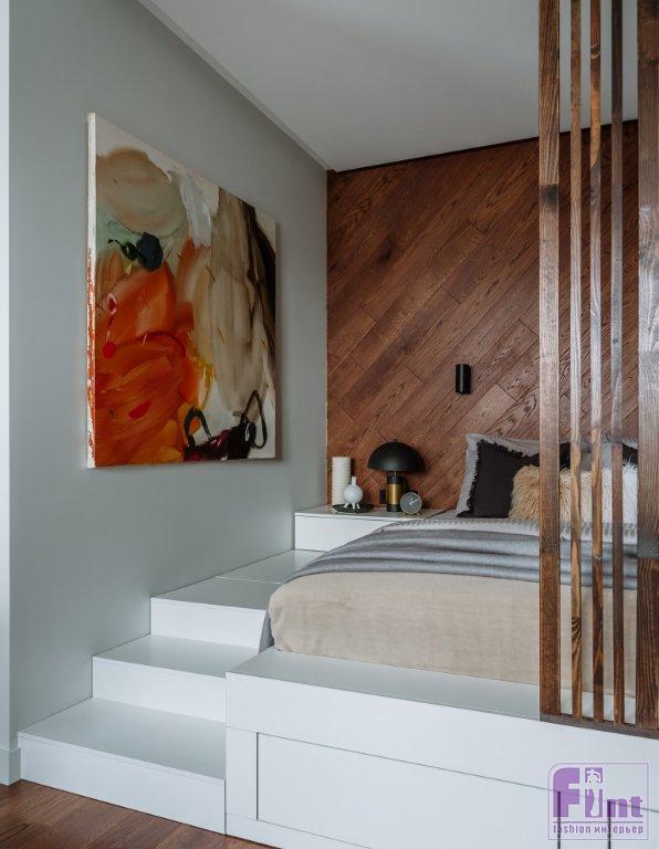 В глубине квартиры расположилось спальное место на подиуме, который также выступает в роли вместительного места хранения для постельного белья и одеял. Психологический комфорт отдыхающему обеспечивает лёгкая перегородка из деревянных ламелей. Ещё одним пожеланием заказчика была большая система хранения для вещей. Ее решили при помощи встроенного шкафа в прихожей.