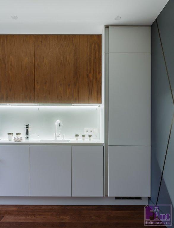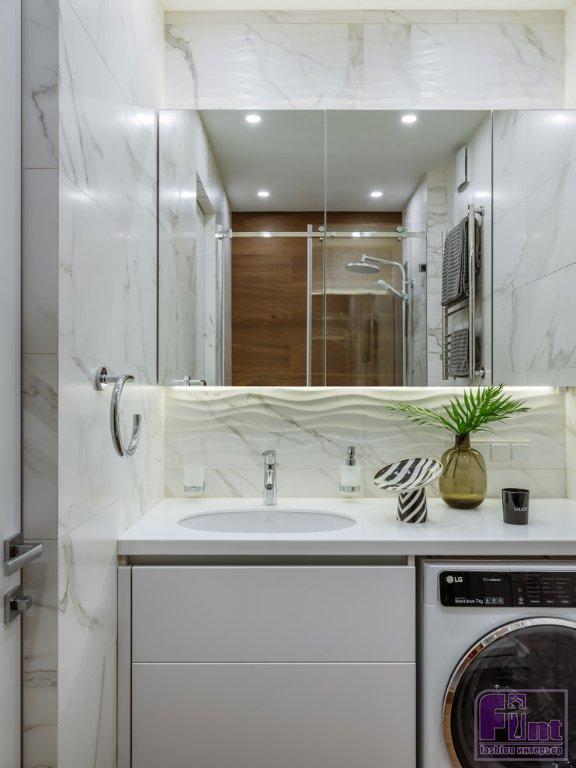 В итоге благодаря светлой отделке стен, мебели и бытовой техники интерьер получился цельным и не перегруженным, притом, что в квартире нет ни одного сантиметра «бесполезной» площади и по проекту наличествует всего два окна.