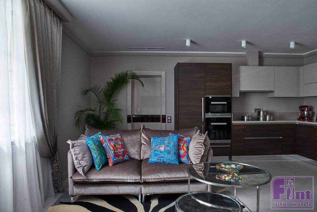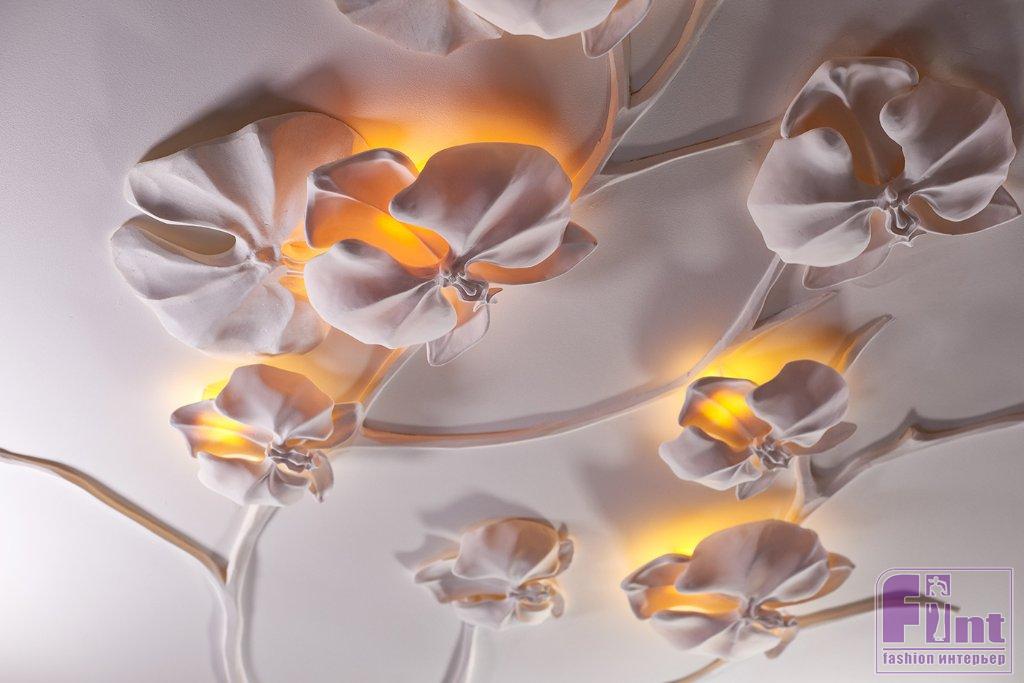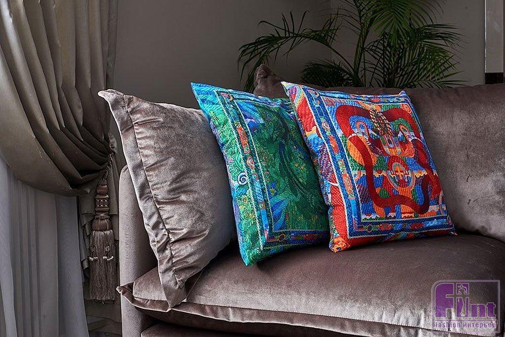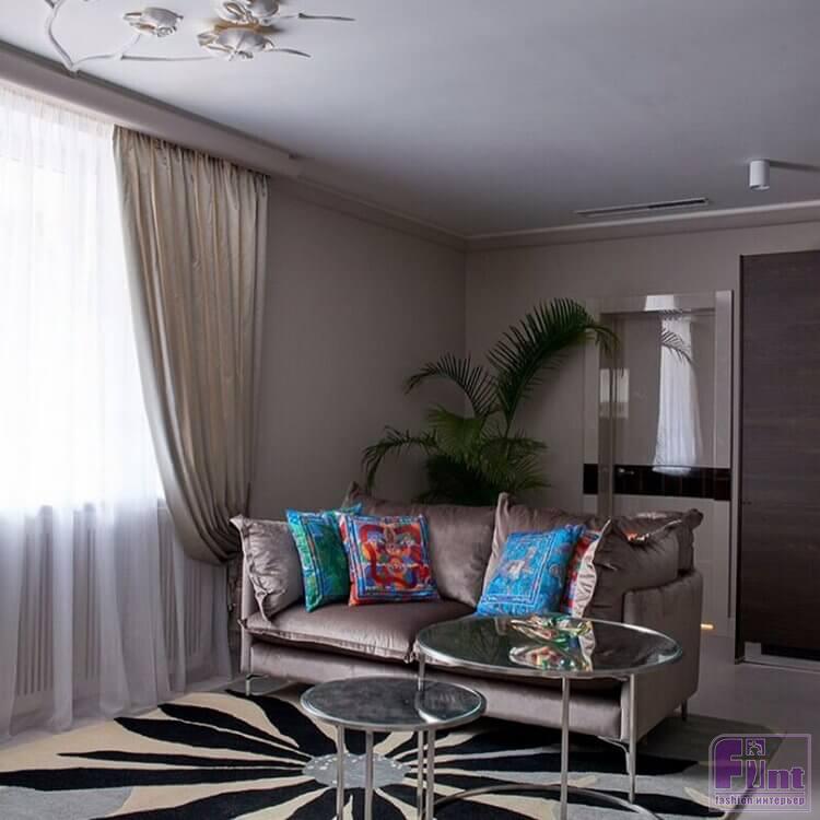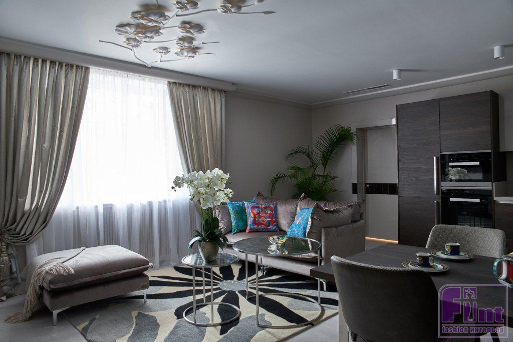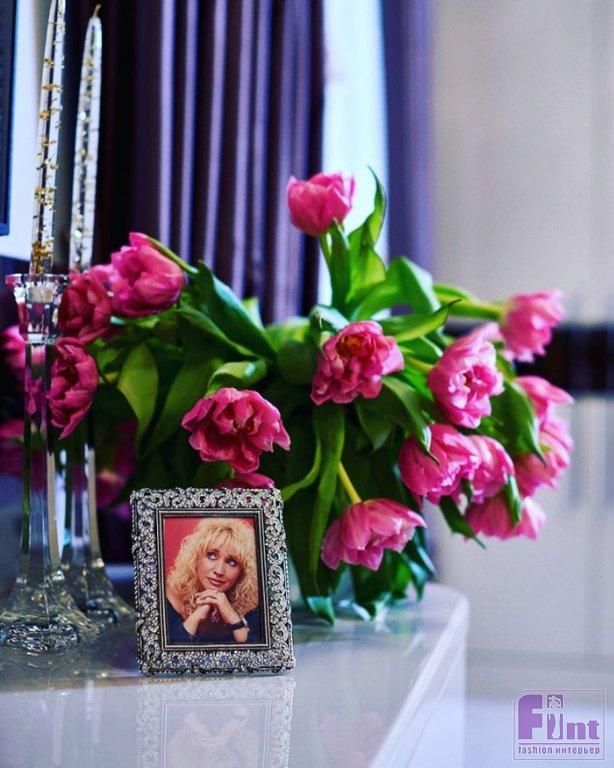 В гостиной артистки портьеры выполнены из итальянского тонкого шёлка с добавлением полиэстера. Дизайнеры позволили себе несколько ярких пятен – цветные декоративные подушки на диване, живые растения и очень необычный светильник на потолке в виде орхидей.