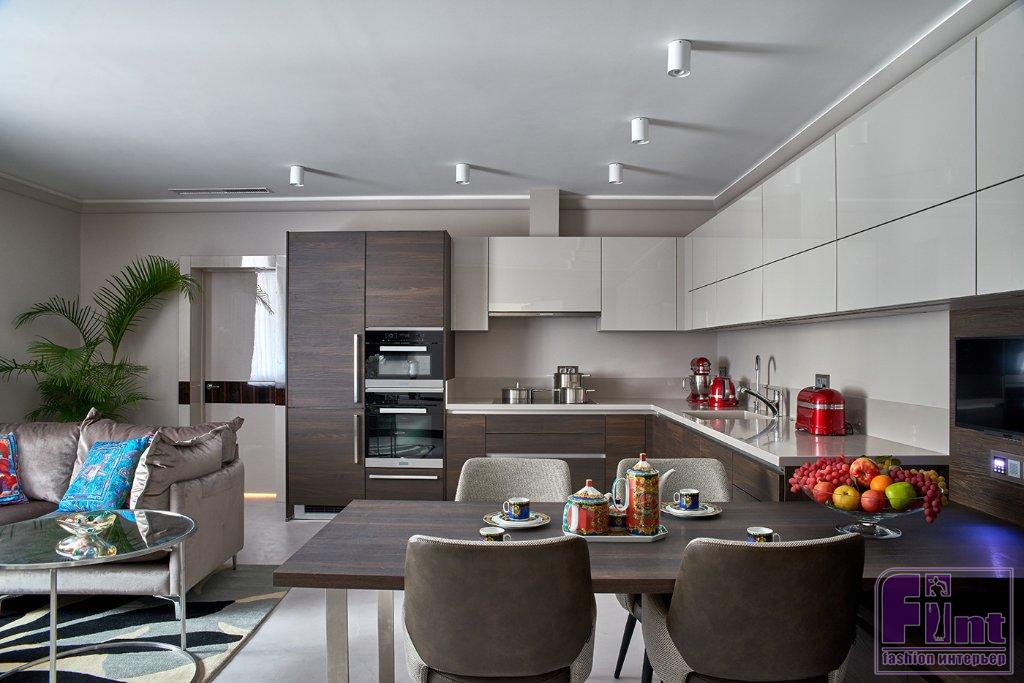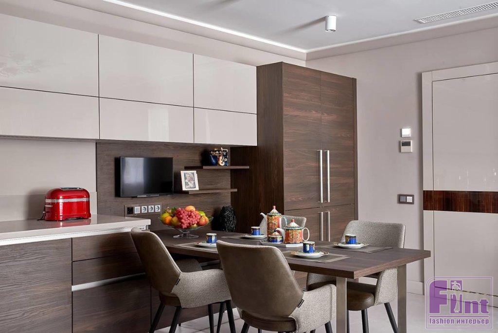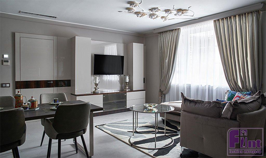 Вся работа началась с устройства пола. По современной технологии сделали очень модный «венецианский» пол из специального связующего и мраморной крошки. Стены выкрасили в благородный светло-серый цвет экологически чистой краской на водной основе. В проекте большую роль сыграла встроенная мебель российского производства. Все шкафы изготовлены из МДФ с использованием новейших технологий.
