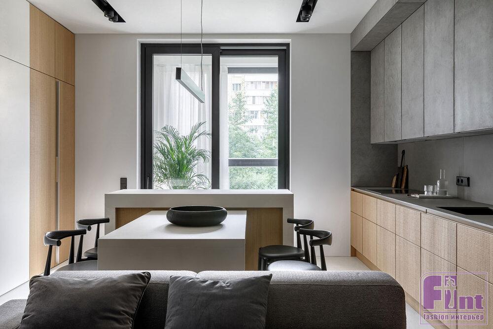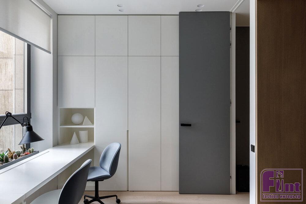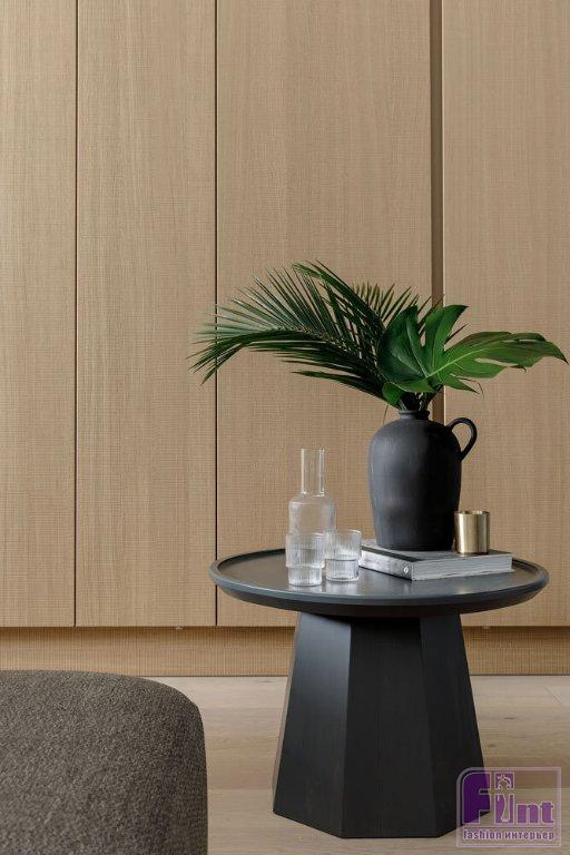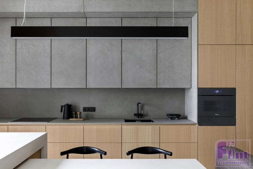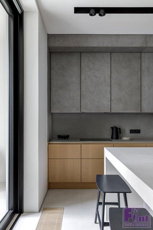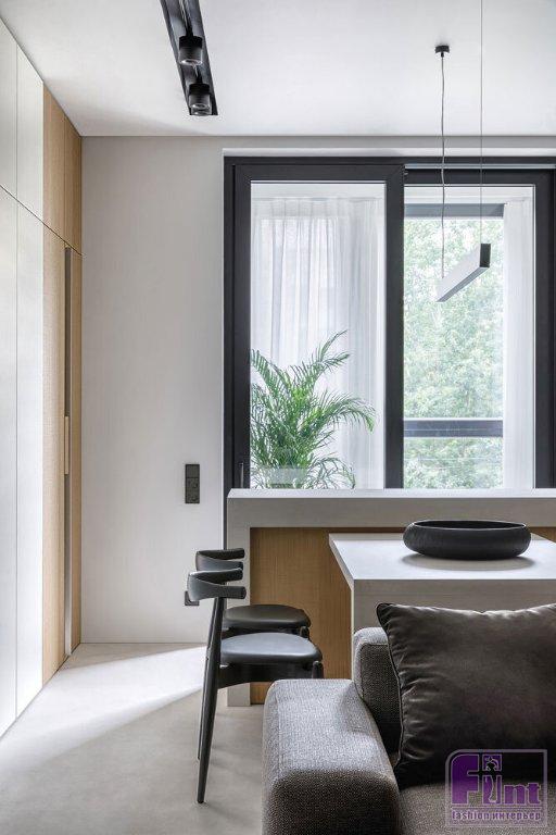 Основной палитрой была выбрана почти монохромная гамма, где белые, серые и бетонные поверхности насыщаются теплом натурального дерева и текстиля из натуральных волокон приглушенных оттенков. Кроме того, отвечая тенденциям современного дизайна, дизайнеры организовали в квартире большое количество удобных и объёмных систем хранения, которые деликатно скрыты от глаз, благодаря выбранному деликатному цветовому решению.