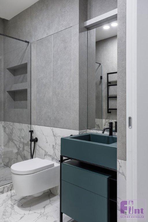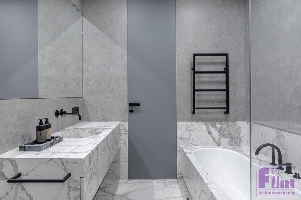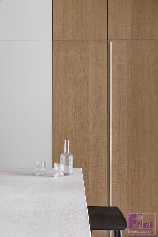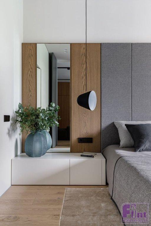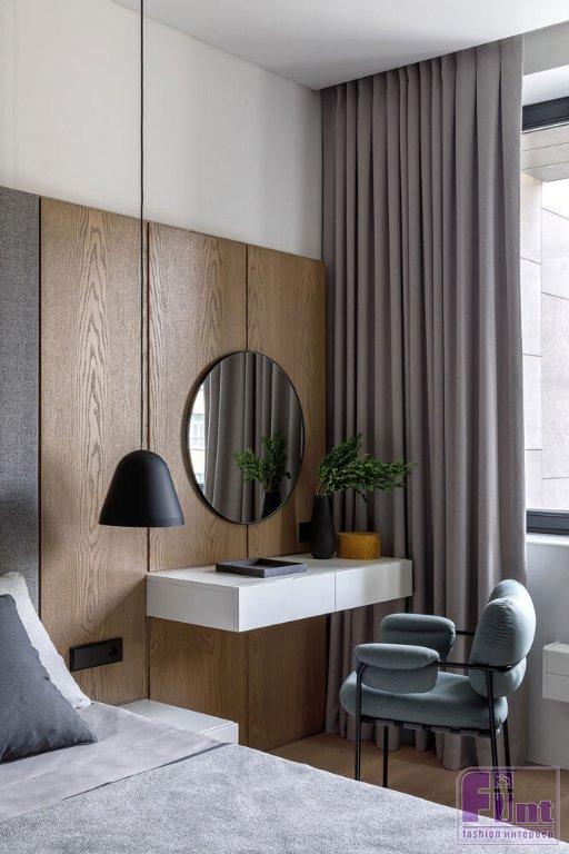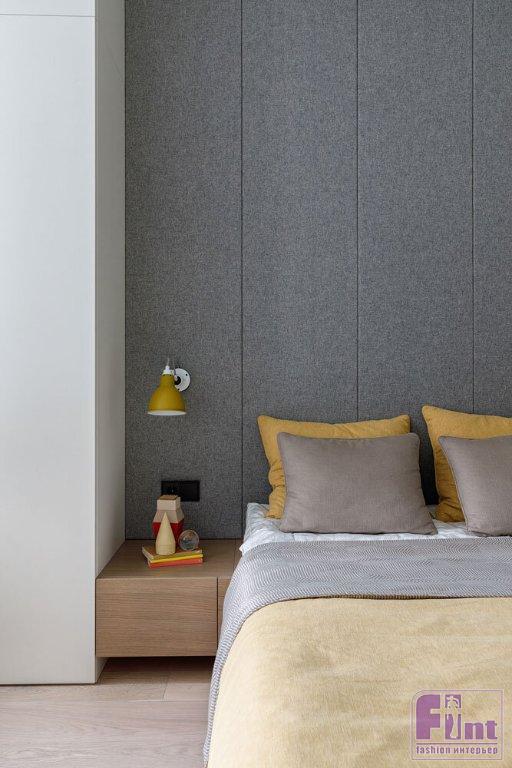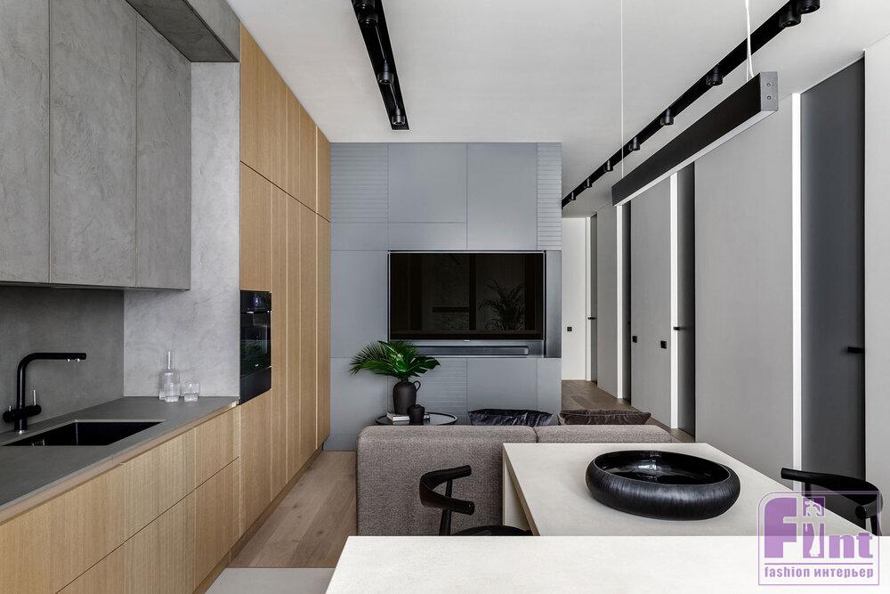 Основной палитрой была выбрана почти монохромная гамма, где белые, серые и бетонные поверхности насыщаются теплом натурального дерева и текстиля из натуральных волокон приглушенных оттенков. Кроме того, отвечая тенденциям современного дизайна, дизайнеры организовали в квартире большое количество удобных и объёмных систем хранения, которые деликатно скрыты от глаз, благодаря выбранному деликатному цветовому решению.