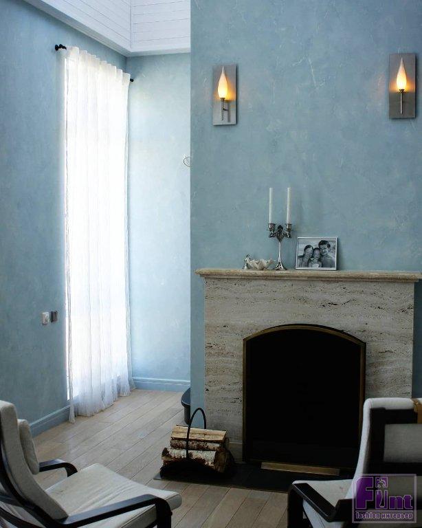 Центральным элементом гостиной является камин. В отделке стен использована декоративная штукатурка. Классическая люстра придает интерьеру атмосферу изысканности. Темный тон лестницы — цветовой акцент. В отделке второго этажа использована доска, выкрашенная в белый цвет.