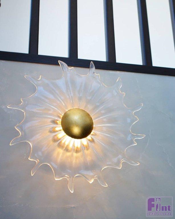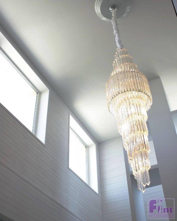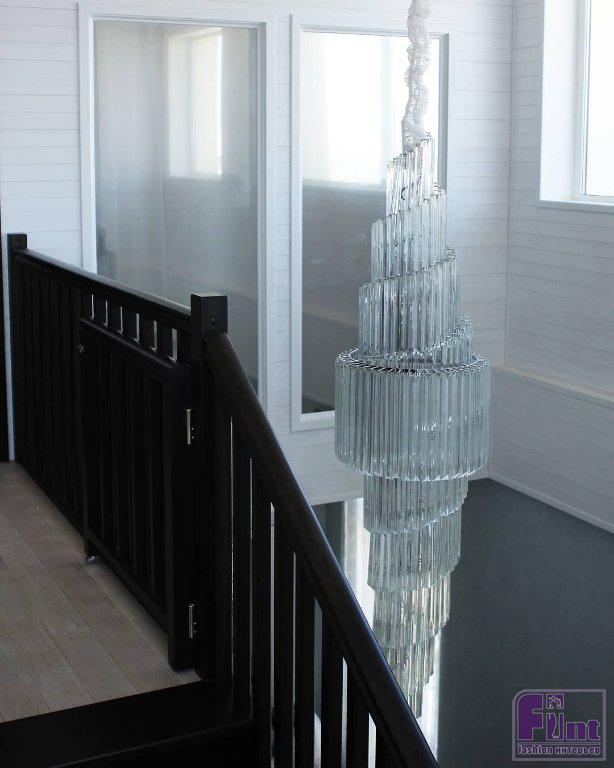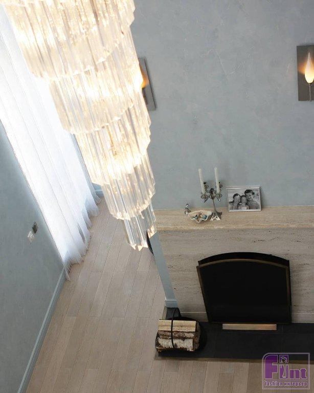 В дизайне этой двухуровневой квартиры дизайнером были найдены специальные решения, чтобы органично вписать дымоход от камина, за которым спряталась лестница на второй этаж. Центральная люстра из муранского стекла является украшением первого и второго этажа, она оснащена специальным подъёмным механизмом, чтобы было удобно обслуживать этот внушительный по габаритам светильник.
