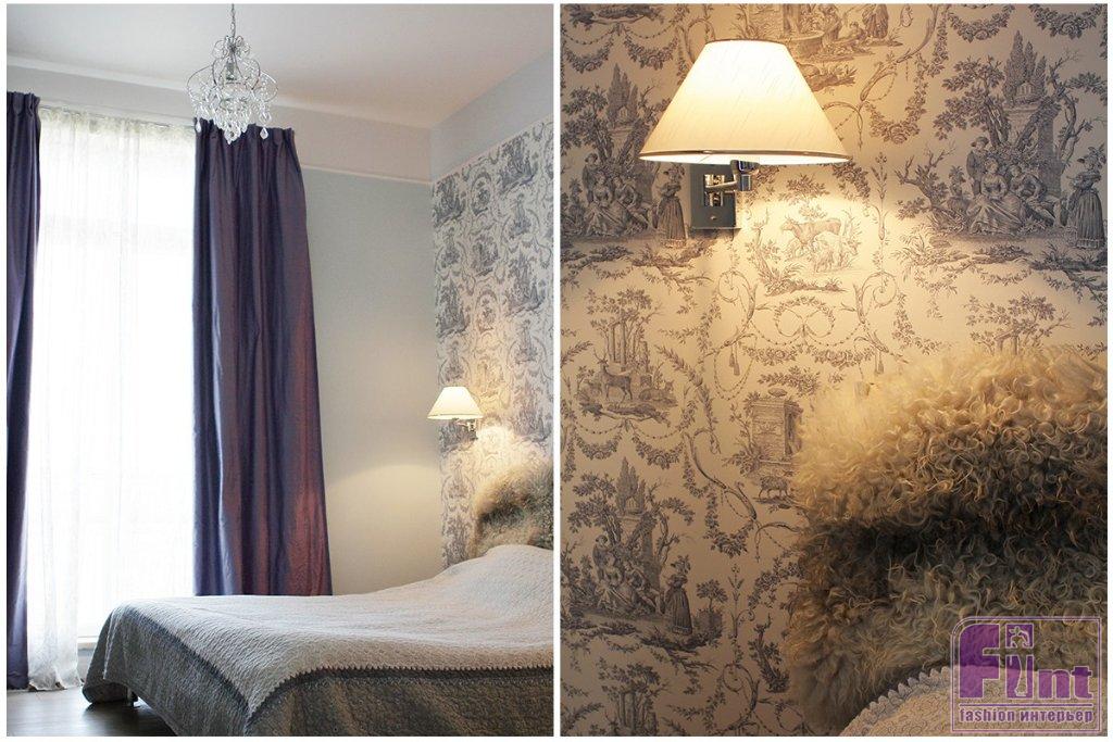 Хозяйская спальня выполнена в классическом стиле с использованием акцентной стены. Для оформления акцентной стены дизайнер выбрала стильные фрески с классическим прованским сюжетом. Плитка на кухне по своему цвету и необычной фактуре напоминает морскую гладь.