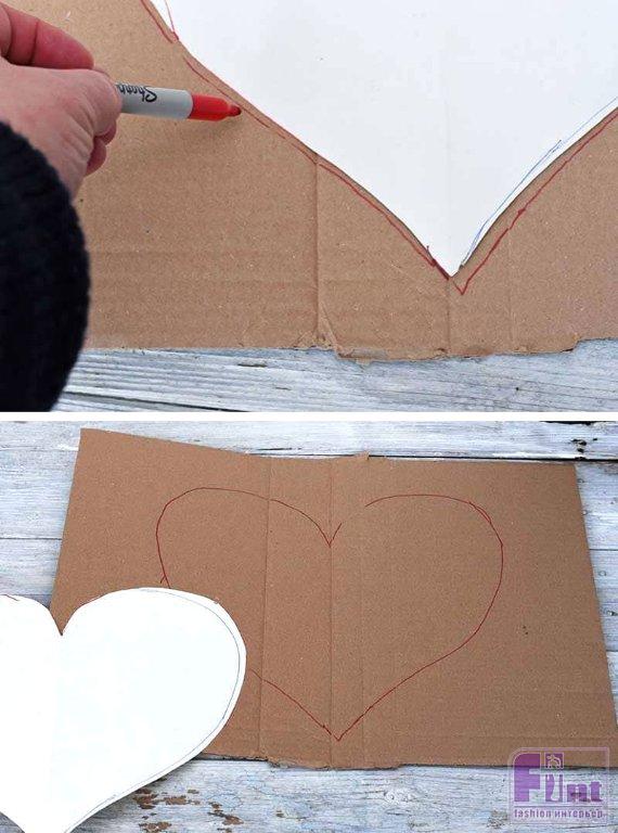 Сначала сделайте картонную основу для объёмного сердца из папье-маше. Сложите большой лист бумаги пополам. От сгиба нарисуйте половину сердечка и вырежьте его так, чтобы получился идеально симметричный шаблон сердечка. Поместите шаблон сердечка на обрезок картона и обведите его фломастером или карандашом.