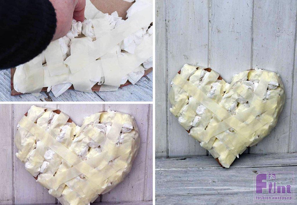 Вырежьте сердечко из картона по намеченному контуру. Чтобы придать сердечку объём, скрутите бумажные кухонные полотенца в шарики и приклейте их к картонному сердцу малярной клейкой лентой. Продолжайте до тех пор, пока шариками не покроется всё сердце, и не сформируется необходимый объём.