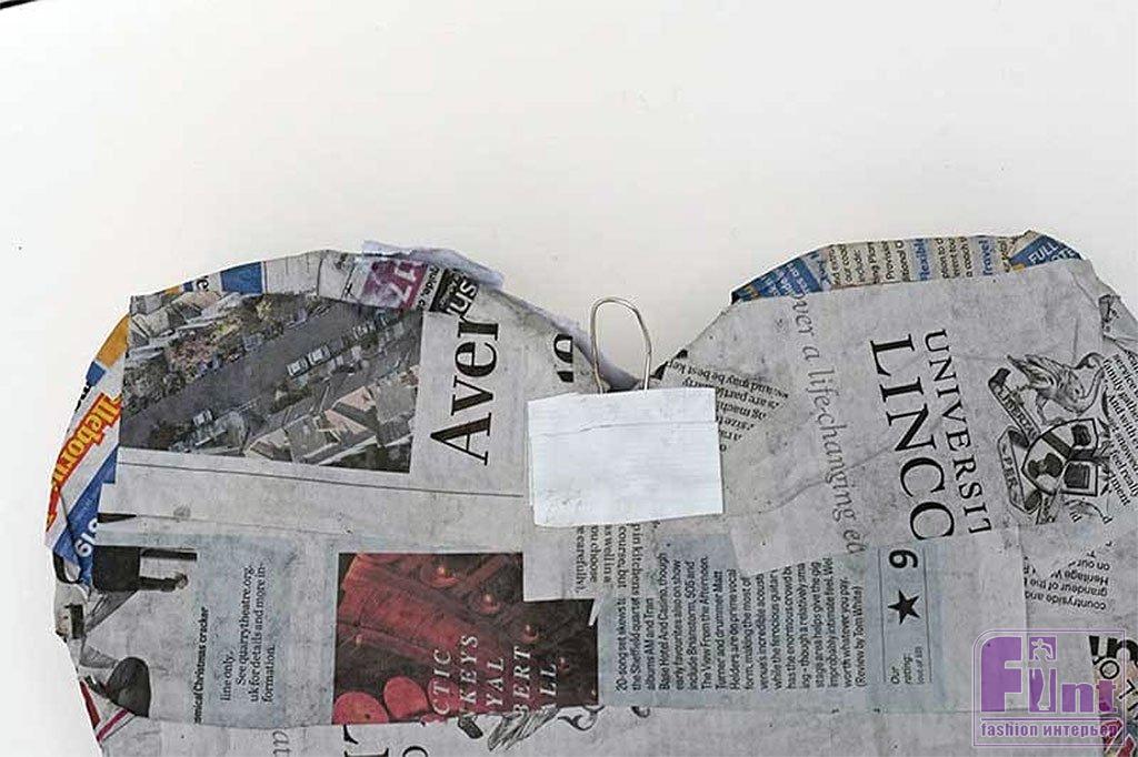 Затем, используя узкие полоски газеты, начните создавать поверхность сердечка в технике папье-маше. Разрежьте газету на полоски, затем покройте их смесью клея и воды в соотношении 50/50.