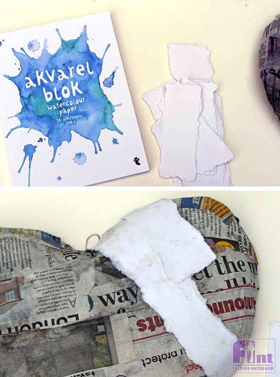 Как только газетный слой на сердечке высохнет, нанесите второй слой. Но на этот раз используйте рваные полоски акварельной бумаги вместо газет. Акварельную бумагу мы используем, поскольку планируем декорировать сердечко акварельными чернилами. Расплывающийся эффект акварельных чернил лучше всего выглядит именно на бумаге для рисования акварелью.
