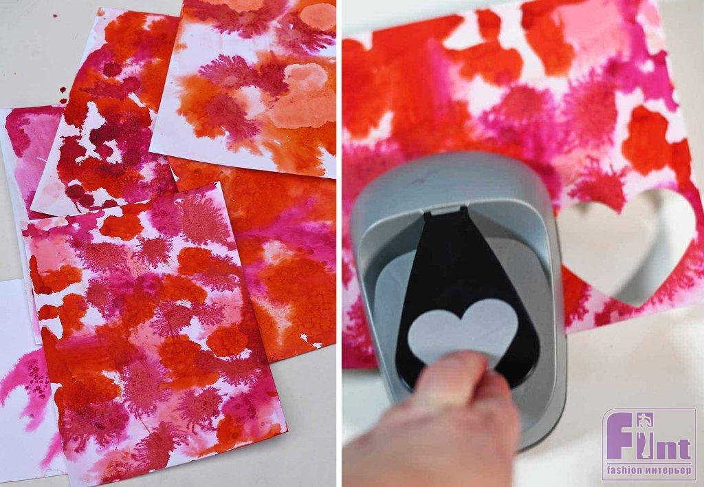 Используя вырубку в форме сердца, заготовьте примерно 30 сердечек, задействовав ваши «тренировочные» листы. Если у вас нет такой вырубки в форме сердечек, просто нарисуйте на акварельных листах небольшие сердечки по подходящему шаблону и вырежьте их вручную с помощью ножниц.