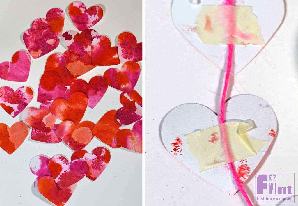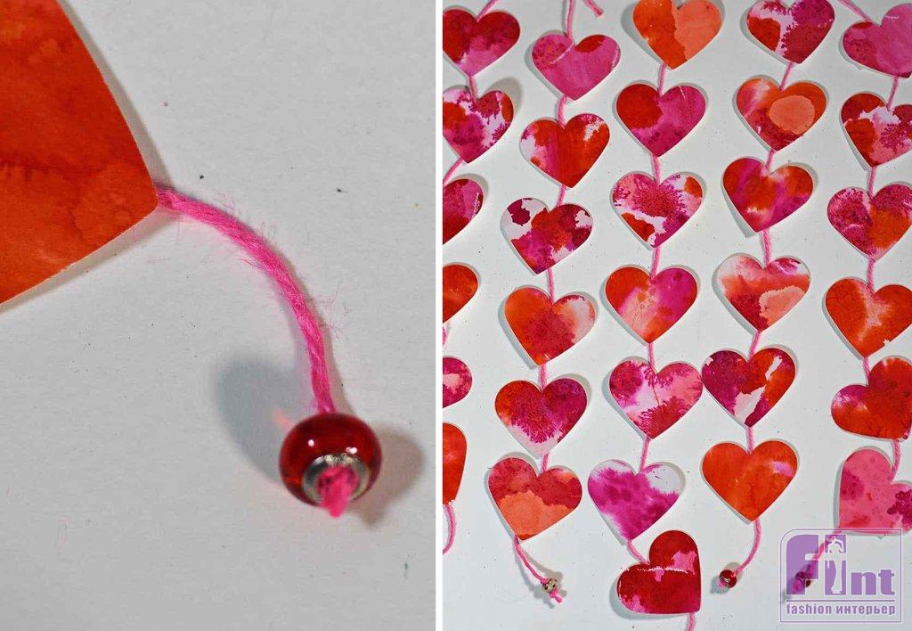 Оформление объёмного сердечка подвесными украшениями из акварельных сердечек