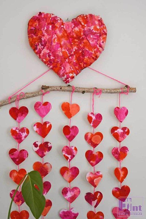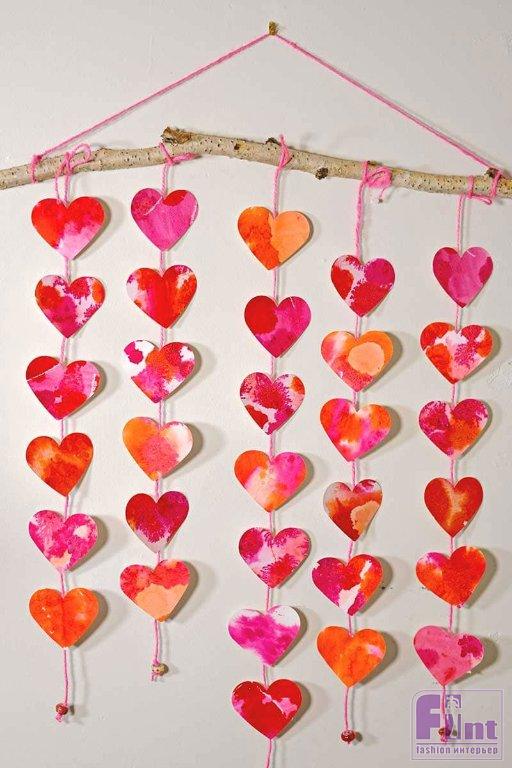 Теперь можно прикрепить пять подвесок с акварельными сердечками на шпагате к красивой ветке, равномерно распределив их по ширине ветки. Саму ветку подвесьте при помощи того же шпагата, привязав его к концам ветки. Осталось вкрутить в стену шуруп или приклеить на надёжную двустороннюю клейкую ленту крючок, и повесить на него, сначала, подвеску, а поверх неё – объёмное сердечко.
