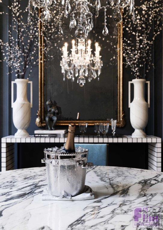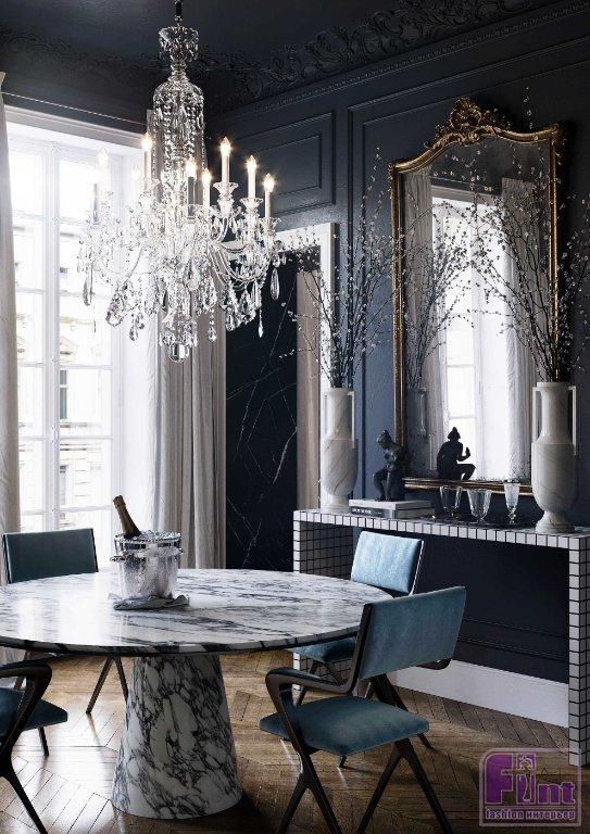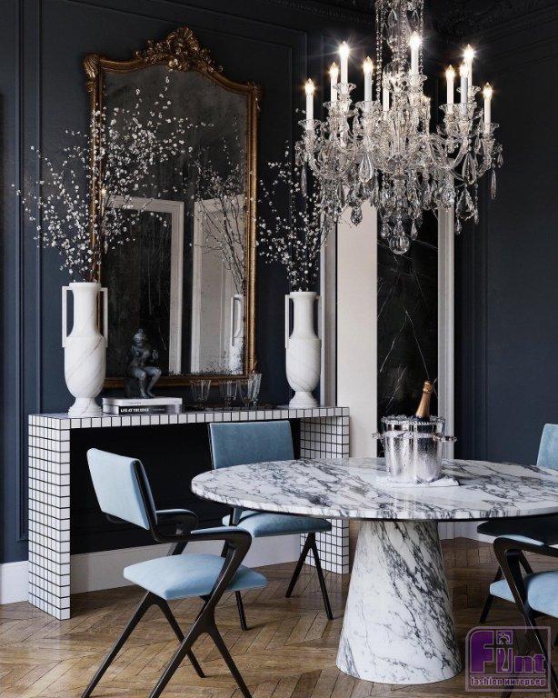 Интерьер кухни также выполнен на стыке классики, винтажа и современности. В зоне столовой тёмные стены и потолок образую монолитное, не лишённое интимности пространство, словно «обволакивающее» круглый мраморный стол и стулья с элегантной обивкой небесного цвета.