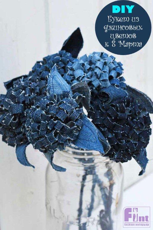 Сегодня мы предлагаем вам сделать невероятно красивый букет, который одновременно является и крайне необычным, поскольку для изготовления цветов мы будем использовать самую обычную джинсовую ткань. Такой удивительный букет, без сомнения будет оценён по достоинству, и станет прекрасным украшением вашего интерьера даже после праздника 8 Марта!