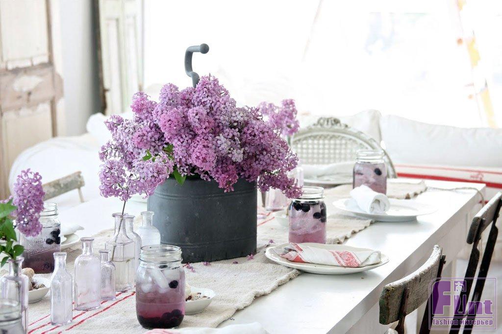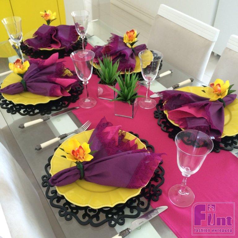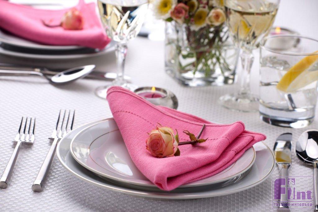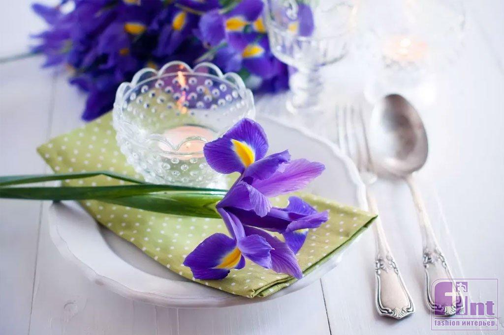 Цвет посуды и столовых приборов также не должен нарушать гармонию стиля. Тарелки могут быть ослепительно белыми, как подснежники, или с флористическим рисунком. Салфетки выбирайте в тон цветочной композиции, которая будет украшать ваш праздничный стол, или точно подбирайте их под цвет и рисунок раннера.