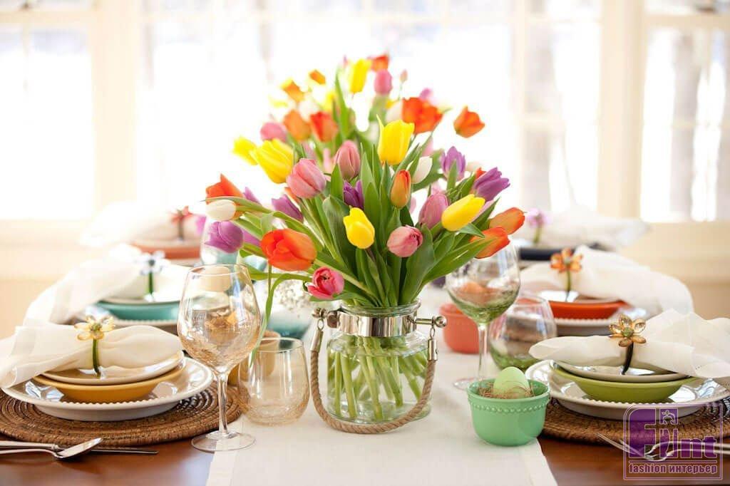 Оформление праздничного стола начните с выбора скатерти. Обычно берут скатерть льняную или из 100% хлопка, и традиционного белого цвета. Но из каждого правила есть исключения. Если вы точно знаете, какие цветочные композиции будут украшать ваш стол, выбирайте скатерть, чтобы она выгодно подчёркивала красоту весеннего букета.