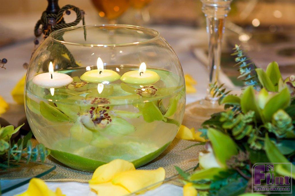А ещё цветочные бутоны, отделённые от стеблей, могут плавать в воде, совсем как водяные лилии. Для такой композиции можно взять широкую мелкую или высокую ёмкость. И вместо водяных лилий запустить в воду бутоны розы, гербера, ромашки или хризантемы. Дополнить композицию можно маленькими плавающими свечами-таблетками.