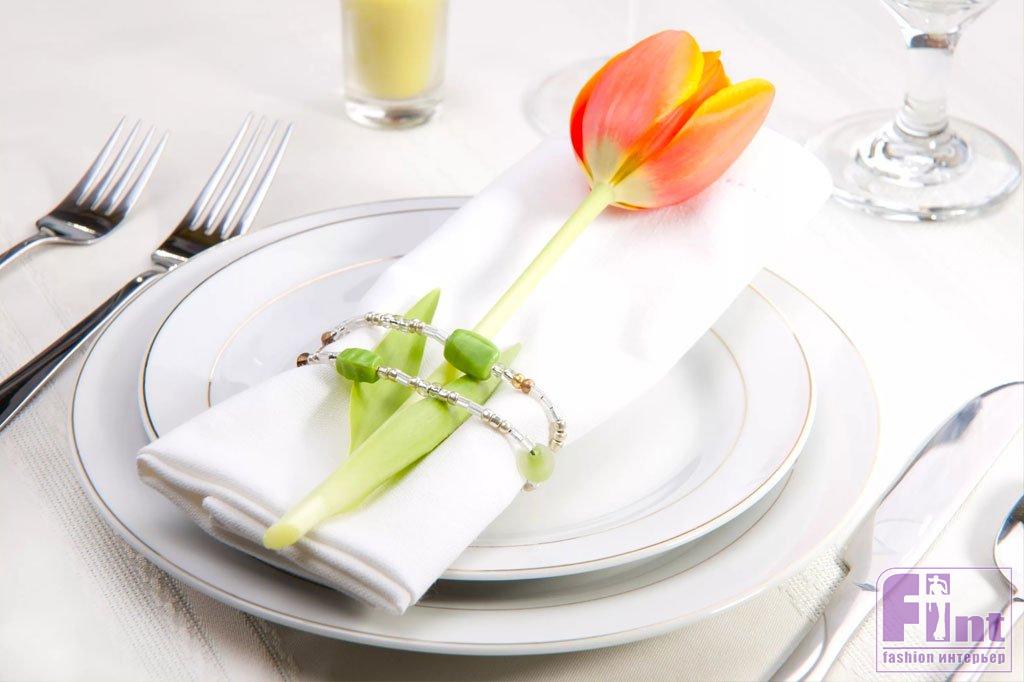 Отличное украшение, придающее принятию пищи торжественности – зажимы и кольца для салфеток. Их можно сделать своими руками, украсив небольшими бутонами искусственных цветов, или же использовать зажимы и кольца фабричного производства. В качестве колец для салфеток прекрасно подходят женские браслеты, украшенные стразами, бусинами и подвесками.