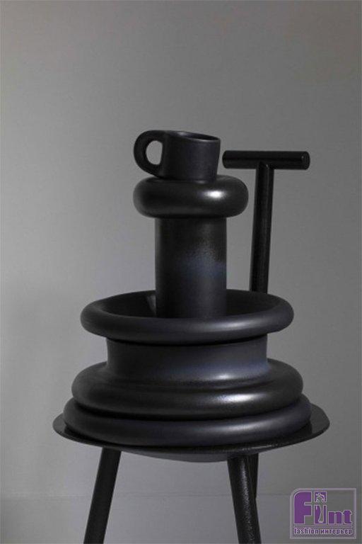 Мягкие силуэты объектов выделяются выпуклыми формами и толстыми, похожими на пончики деталями. Каждому предмету придавали форму вручную, а затем лепили из глины. Посуда доступна в двух оттенках: кремовом и угольном с матовой отделкой, в то время как более декоративные предметы покрыты глазурью, которая сочетает в себе шелковистую матовую и блестящую текстуры.