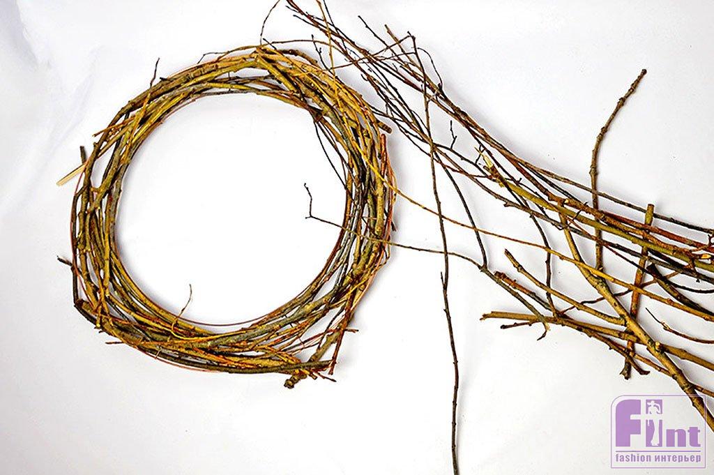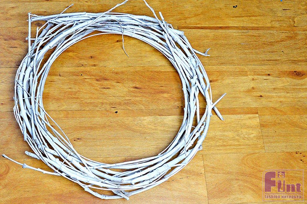 Сначала сделайте основу для венка из мягкой, но довольно толстой проволоки. Затем начните вплетать в проволочное кольцо подготовленные веточки. Для создания красивого венка нам потребуется 5 – 6 веточек. Кстати, свежие ветки лучше гнутся, нежели высохшие. Это делает свежие ветки более пригодными для создания венка красивой формы, и позволяет не беспокоиться, что веточки сломаются при сгибании.