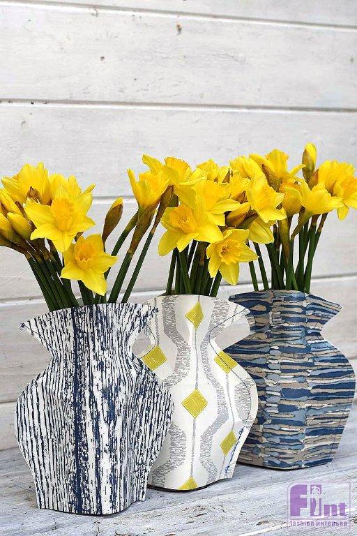 Но возникает резонный вопрос. А где взять столько ваз, чтобы украсить свой дом многочисленными букетиками? Не будешь же ставить цветы в скучные стеклянные, безобразные консервные банки или в пластиковые бутылки с отрезанным горлышком! Хотя, почему бы и нет? Нужно лишь придумать, как задекорировать все эти банки и бутылки, не прикладывая к этому особых усилий и не затрачивая много средств. И такое решение есть! Очень симпатичные вазы из… БУМАГИ! Вернее, из остатков и обрезков старых бумажных обоев или плотной дизайнерской бумаги.