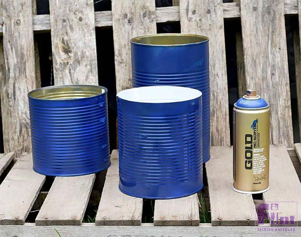 Прежде всего, следует удалить этикетки со старых жестяных банок подходящего размера и окрасить их краской насыщенного тёмно-синего цвета. Работать с аэрозольными красками лучше в хорошо проветриваемом помещении или на улице, используя необходимые средства индивидуальной защиты. Для создания сочного оттенка вам может потребоваться наложить несколько слоёв краски, каждый раз ожидая высыхания предыдущего слоя.