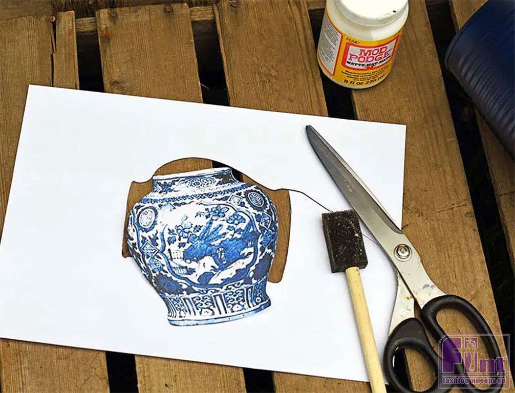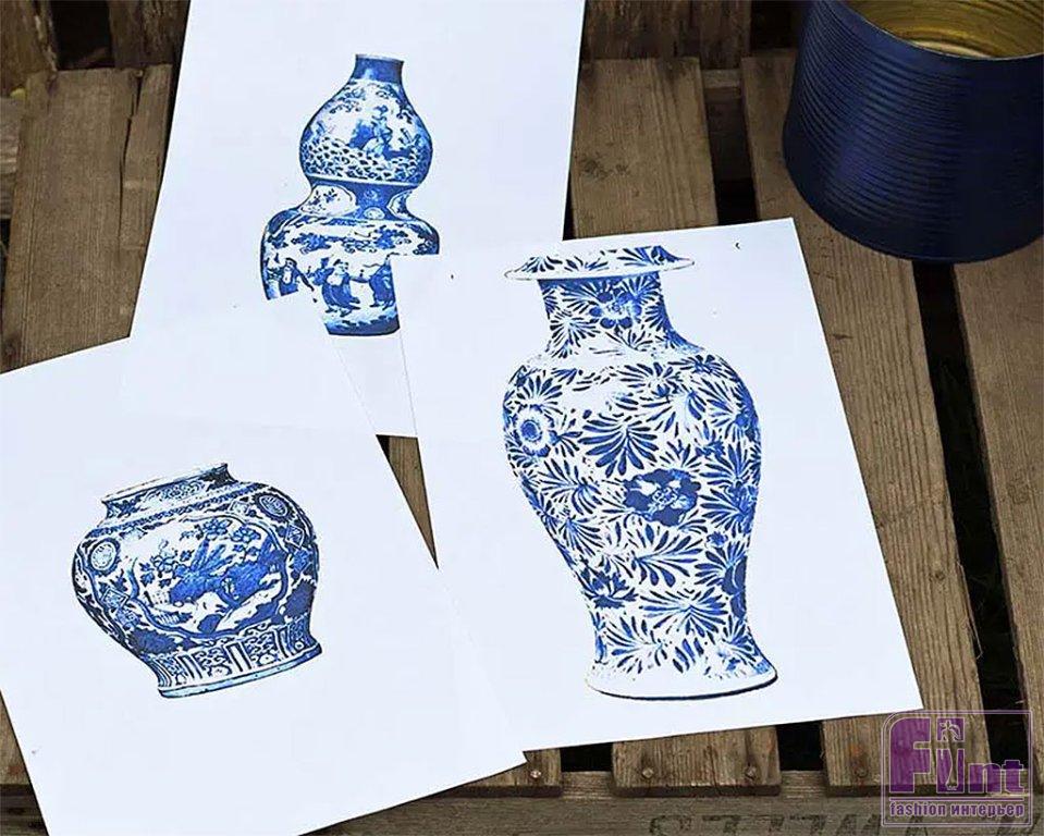 Пока ваши окрашенные банки будут сохнуть, скачайте из интернета и распечатайте на цветном принтере шаблоны бело-синих китайских ваз. Подберите изображения ваз в одинаковом стиле разных размеров, чтобы они подходили по высоте ваших банок. Поскольку мы будем наклеивать распечатанные изображения ваз, используя технику декупажа, возьмите в качестве основы наиболее тонкую бумагу для вашего принтера.
