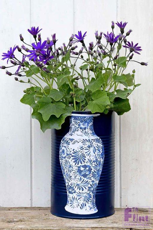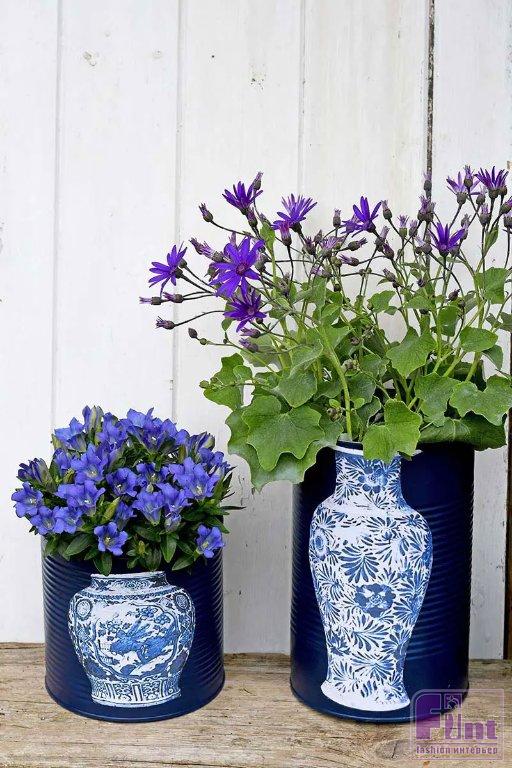 Почти готово! Осталось посадить в наши вазы цветы. Мы решили, что в наших сине-белых вазах потрясающе будут смотреться цветы синего оттенка. Поскольку жестяные банки могут выступать не только в роли ваз, но и в роли цветочных горшков, вы можете посадить в ваши вазы цветы, используя дренаж и почву для домашних растений.