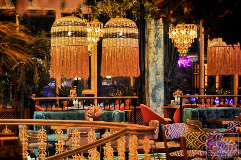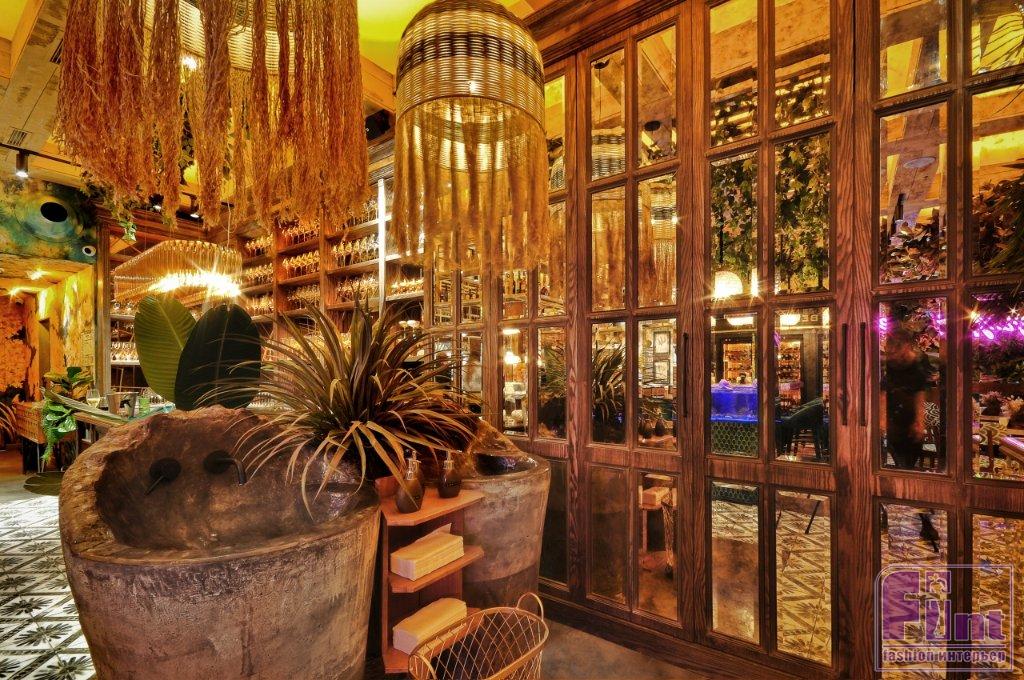 В этом богатом на цвета и формы интерьере не обошлось и без множества стильных аксессуаров, тщательно подобранных и помещённых на свои места дизайнером. Необычные массивные раковины из камня, плетёные люстры со струящимися кистями, винные шкафы в традиционном английском стиле с контрастной подсветкой, тематическая мебель, вариация на тему мега популярного зеркала-солнца на стене в окружении «парящих» гербариев, множество росписей и декораций – всё это весьма органично дополняет созданный Артемием Сараниным интерьер и делает его невероятно цельным завершённым.
