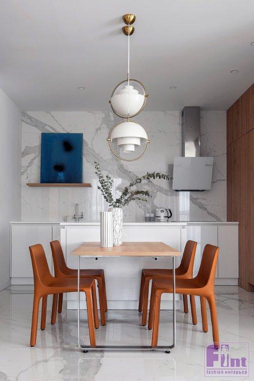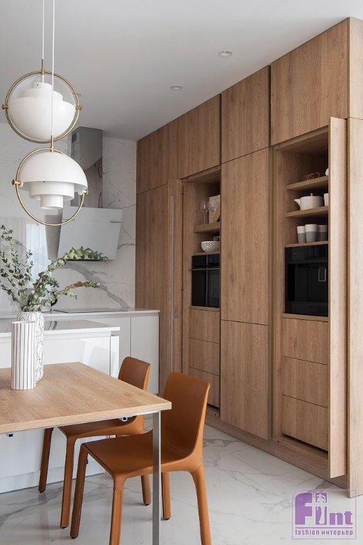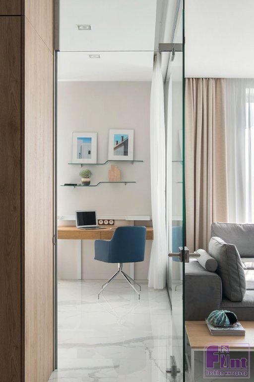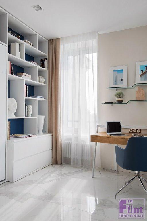 Немаловажную роль в проекте играет весьма актуальная в современных интерьерах мебель с возможностью трансформации. Одна из таких трансформируемых мебельных конструкций нашла своё место в рабочем кабинете. Здесь дизайнеры предложили установить стеллаж для книг с секретом — в нём прячется откидная кровать и мини-комод. Благодаря такому решению кабинет можно буквально за несколько секунд превратить в дополнительную спальню с ещё одним комфортным спальным местом. Кухня спроектирована так, что вся необходимая техника и посуда скрыты от глаз. При открытии фасады дверей заезжают в тело стеллажей и не мешают передвижению по кухне.