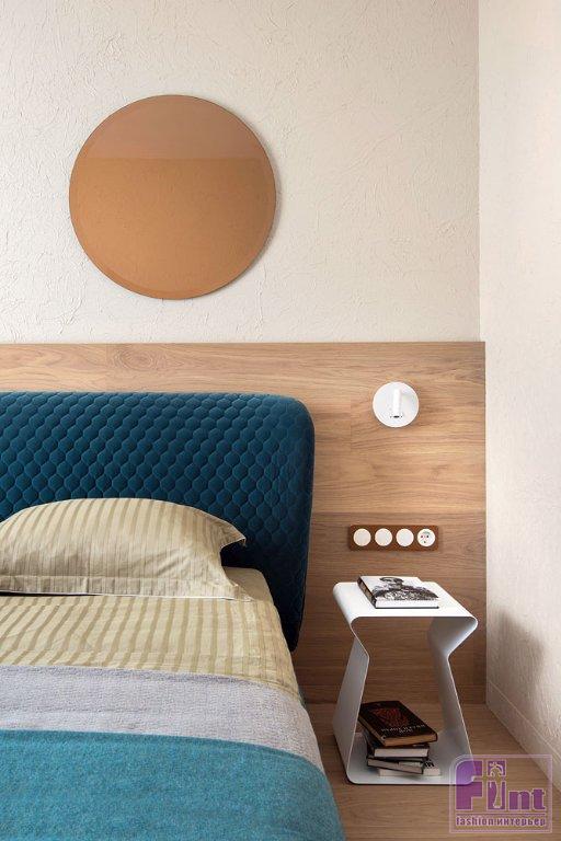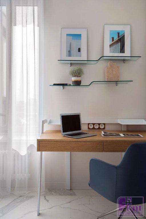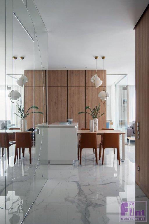 «Мы спроектировали парящую конструкцию в отделке из шпона ореха, которая с потолка переходит на стену и далее в столешницу, опираясь на стеклянную невидимую «ногу», — рассказывают авторы проекта, — Мы продумали её так, чтобы она не перекрывала окно в пол. На одной стене мы решили использовать зеркала, это дало бесконечный вид и игру пространства, некое «московское зазеркалье».