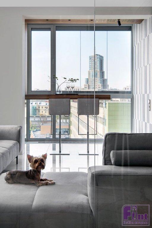Именно это пожелание потребовало от авторов проекта наибольших усилий. В частности, пришлось смонтировать второе остекление — тёплый контур, а также поставить бельгийское видовое окно с минимальным количеством створок, не нарушив при этом внешний вид фасада здания. Барная стойка перед окном спроектирована так, чтобы не загораживать вид на город со стороны гостиной.