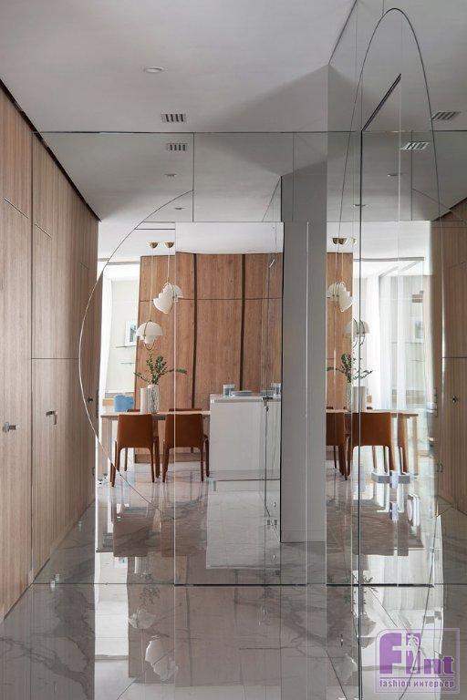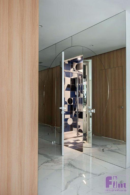 Стекло и зеркала «играют» и в других зонах. Так, кабинет в гостиной спрятали за стеклянными перегородками, а диваны, стоящие по трём сторонам гостиной, дополнили авторскими зеркальными панно. При желании стеклянные стены кабинета можно завесить портьерой, чтобы отделить пространство от гостиной, сделав его максимально приватным. Кроме того, заказчик охотно поддержал смелое предложение авторов проекта обустроить хозяйскую ванную комнату в стеклянном кубе. В прихожей зеркальные стены буквально «растворяют» и расширяют пространство входной зоны.