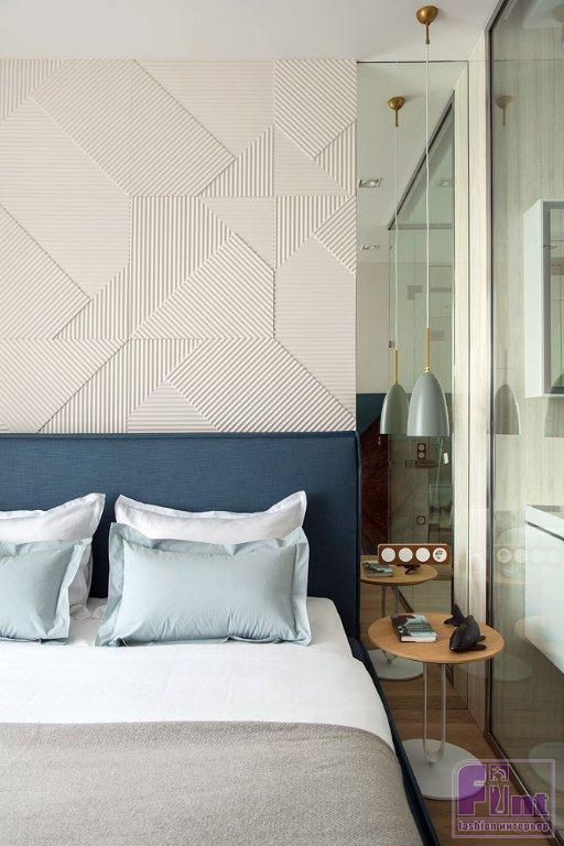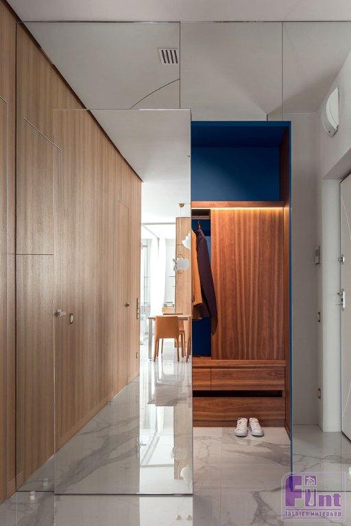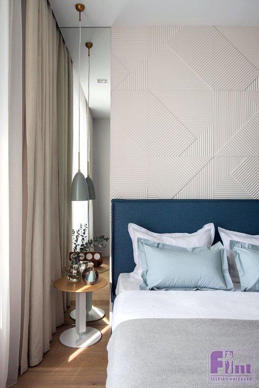 Ярким пятном в интерьере квартиры стал гостевой санузел, который с ходу удивляет необычной отделкой стен синей и чёрной плиткой геометричной формы. Этот сочный синий перекликается со стенами в гардеробной, добавляя экстравагантности и без того далекому от всякой шаблонности интерьеру. Гостевой санузел небольшой, поэтому дизайнеры решили сделать его так, чтобы он вызывал интерес и приятное удивление.