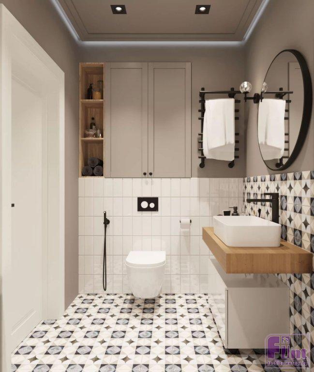 В санузле испанская плитка дополнена керамической плиткой в стиле «Метро», уложенной вертикально, часть стен окрашена водостойкой краской неброского мягкого оттенка. В этот же цвет окрашен и встроенный шкаф, благодаря чему он практически не выделяется на фоне крашеных стен.
