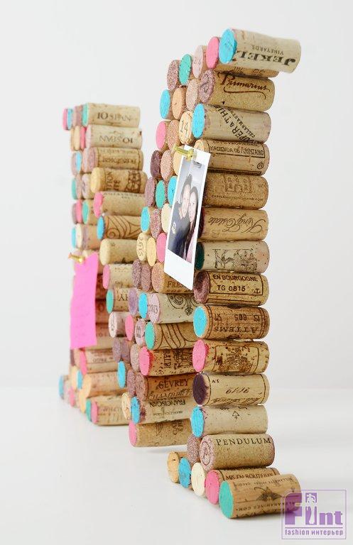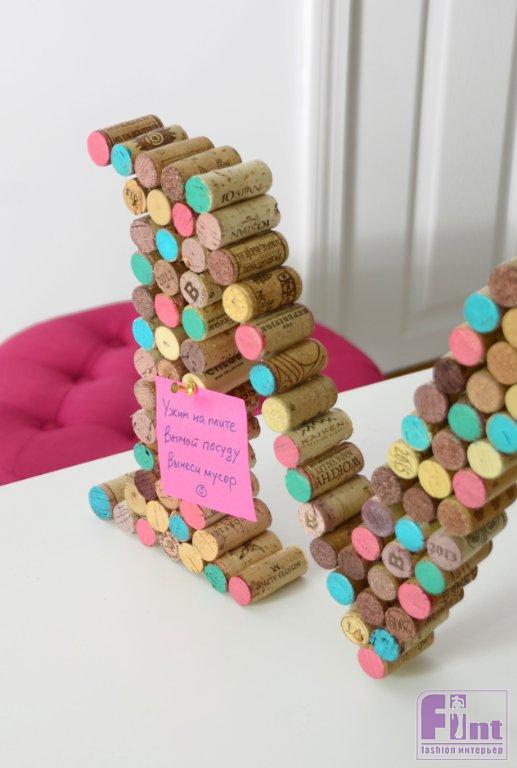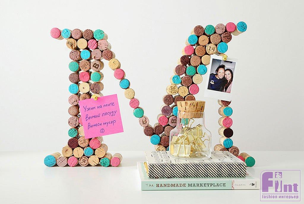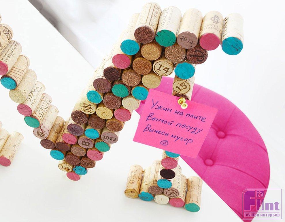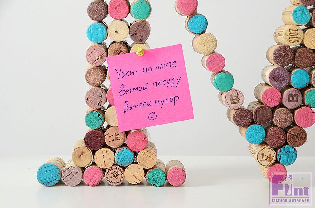 Как только краска на торцах пробок подсохнет, вы можете попробовать украсить её дополнительно, превратив в своеобразную пробковую доску или органайзер для заметок, напоминаний и небольших фотографий. Для крепления записок и фотографий используйте канцелярские кнопки. При этом вы можете выбрать для своей монограммы, выступающей в качестве органайзера, любое положение в интерьере. Её можно оставить на любой горизонтальной плоскости стола, шкафа, комода или тумбочки, или же повесить на стену, прикрепив крепёж с обратной стороны объёмной монограммы.