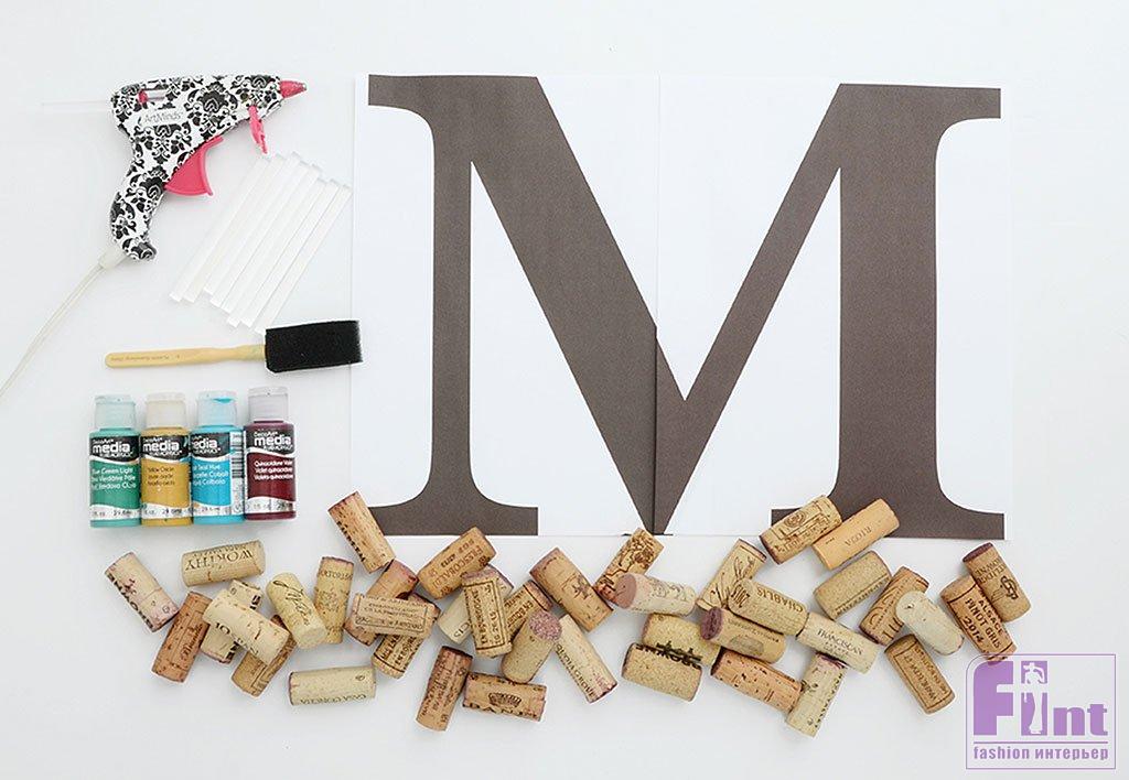 Дизайнерский приём украшения интерьера различными буквами родного или иностранного алфавита, словами и фразами носит название «леттеринг». Этот приём мы частично будем сегодня использовать, сделав своими руками объёмную монограмму из винных пробок. Для нашего мастер-класса мы выбрали букву «М», поскольку она является монограммой нашего главного редактора – с этой буквы начинается его имя. Вы же можете выбрать для своего интерьера любую другую букву, которая как-то связана лично с вами или вашими близкими. Лучше всего выбирать буквы, имеющие в своём написании твёрдые «опоры»: «А», «Н», «К», «И», «Ю» и т.д. Если вы захотите сделать букву округлой формы, например, «О» или с неустойчивой «ножкой», например «Р», то вам может потребоваться дополнить букву подставкой.