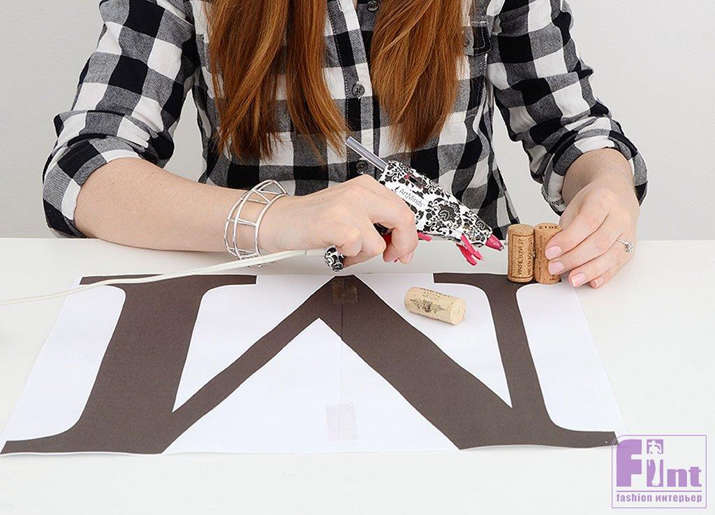 Начинайте клеить винные пробки с нижнего угла буквы, следуя напечатанному контуру буквы. Чтобы убедиться в надёжности клеевого соединения пробок между собой, нанесите полоску горячего клея по боковой стороне пробки и, надавливая, немного подвигайте пробку вперёд и назад в момент приклеивания её к следующей пробке. Если пробка касается нескольких других пробок, нанесите полоску клея в каждую точку соприкосновения.