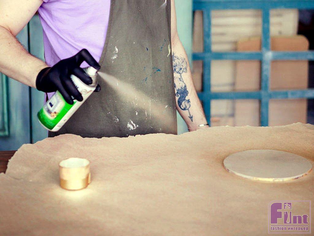 Наносим на заготовку краску — золотую металлик из аэрозольного баллончика. Поскольку нам необходим яркий и насыщенные цвет, окрашивание проводим в два слоя, с интервалом, необходимым на высыхание предыдущего слоя.