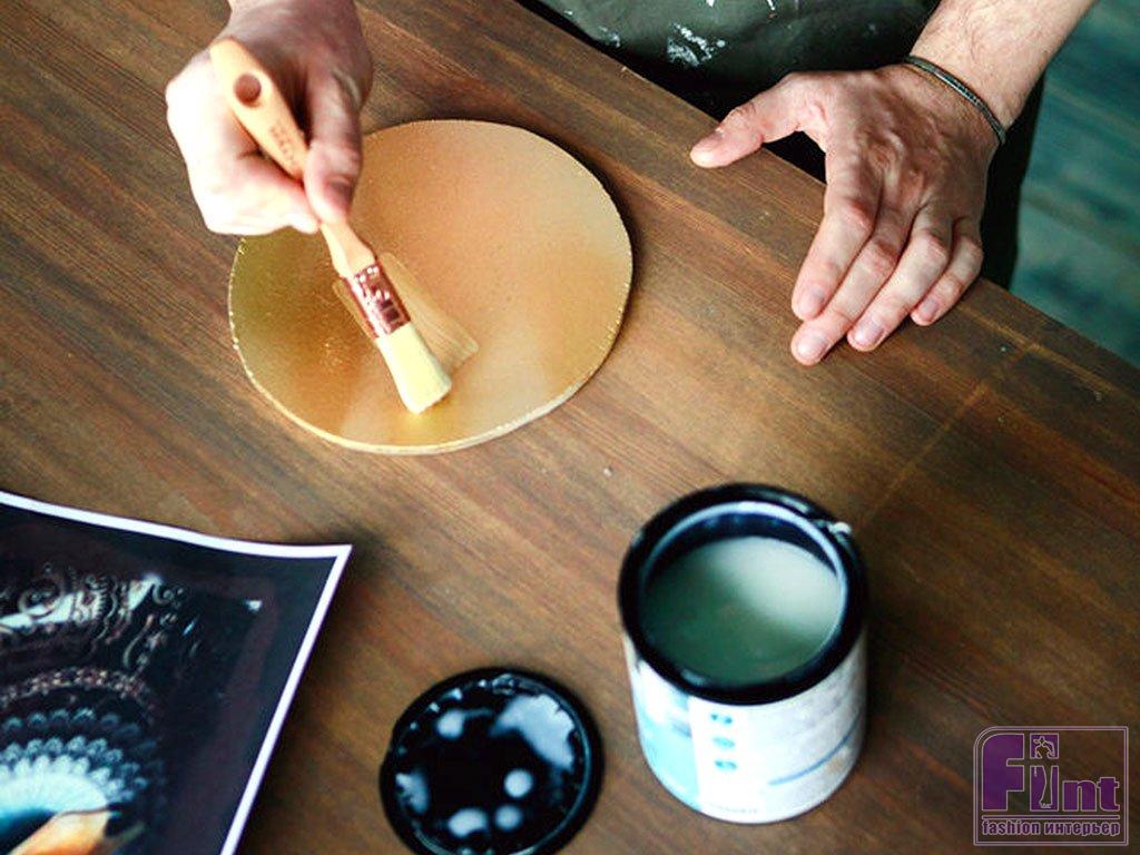 Покрываем окрашенную и высохшую заготовку слоем лака. Не дожидаясь его высыхания, накладываем распечатанное изображение лицевой частью на заготовку, стараясь совместить визуальный центр изображения с фактическим центром заготовки.
