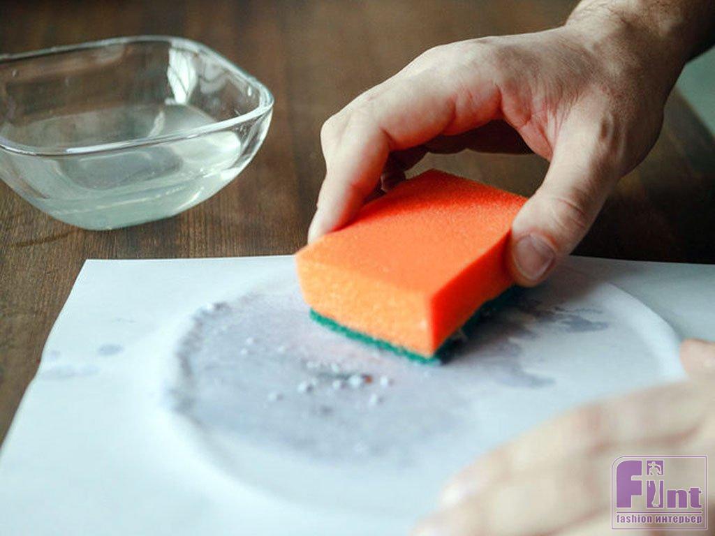 Теперь самая ответственная часть: аккуратно мокрой губкой стираем бумагу слой за слоем, аккуратно удаляя мокрые «катышки» бумаги. После того, как мы удалим всю бумажную основу, самый верхний слой бумаги с нанесёнными на него чернилами останется в лаке. При этом ваше изображение может немножко изменить свой внешний вид, но в данном случае это именно то, чего мы добиваемся. Такая техника переноса позволяет получить изображение, которое выглядит старинным произведением искусства с ноткой благородного винтажа.