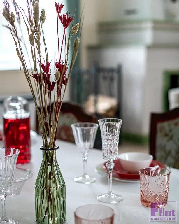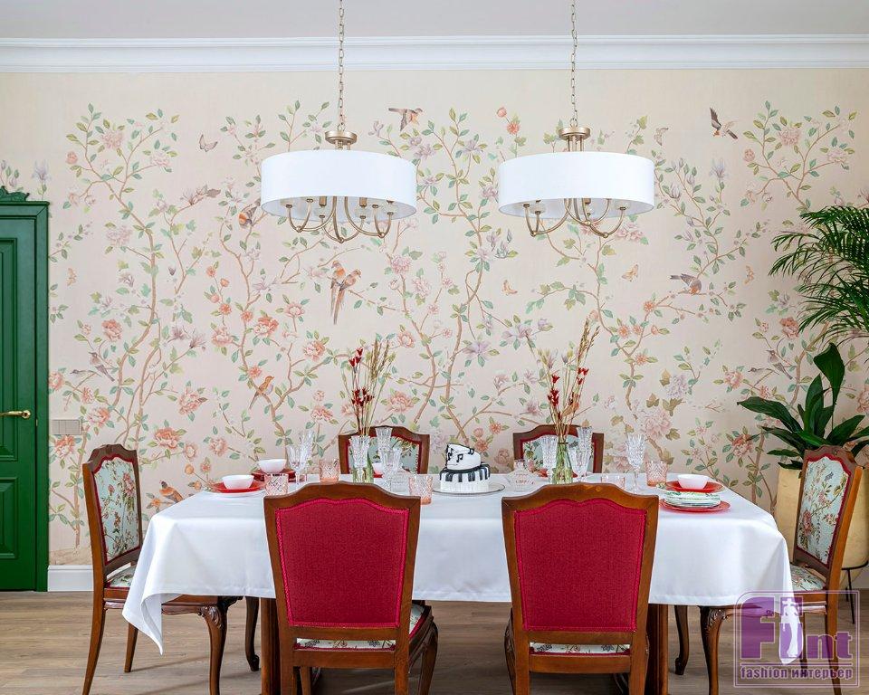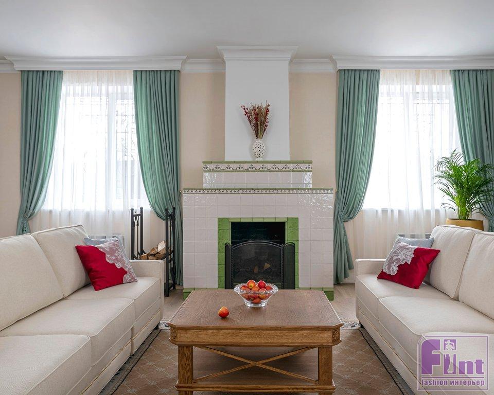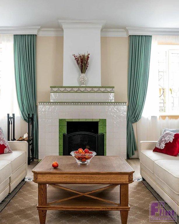 Весь интерьер комнаты выстроили вокруг камина, ставшего центром гостиной. Слева от него решено было сделать обеденную зону, а справа своё место занял музыкальный уголок, где хозяйка дома сможет устраивать импровизированные домашние концерты. Одну из стен в обеденной зоне украсила фреска с изображениями цветов, а камин дополнили декором из нарядных изразцов в испанском стиле.
