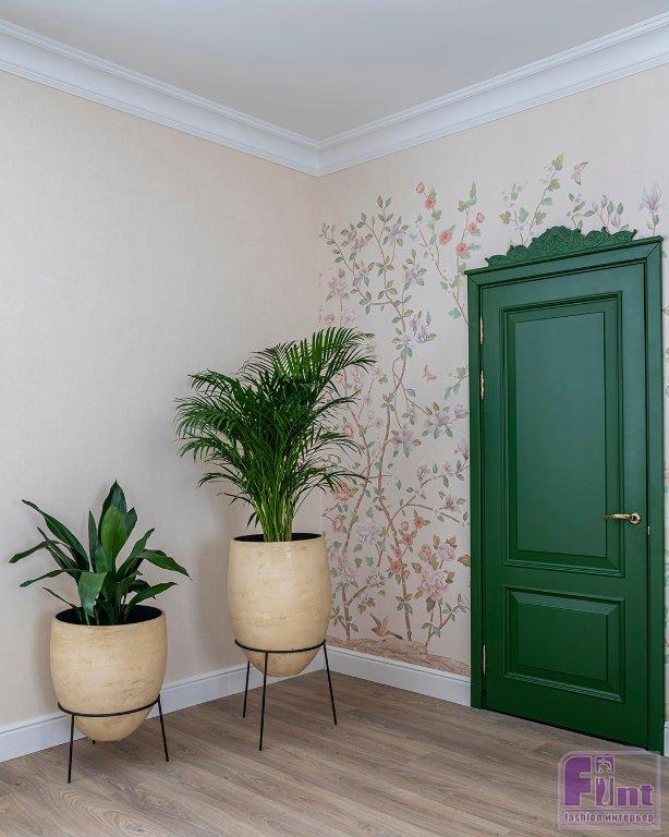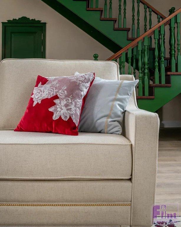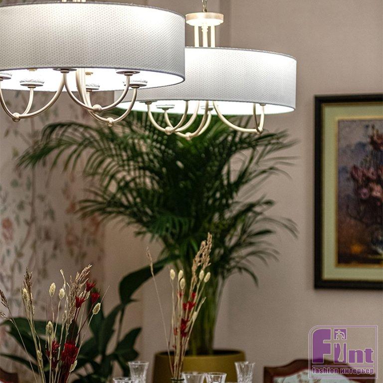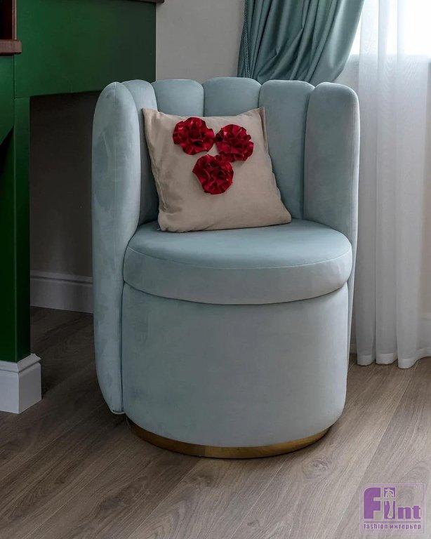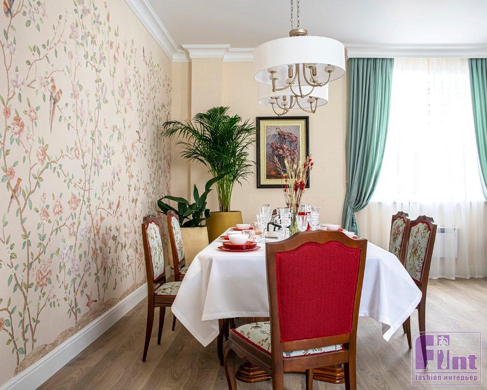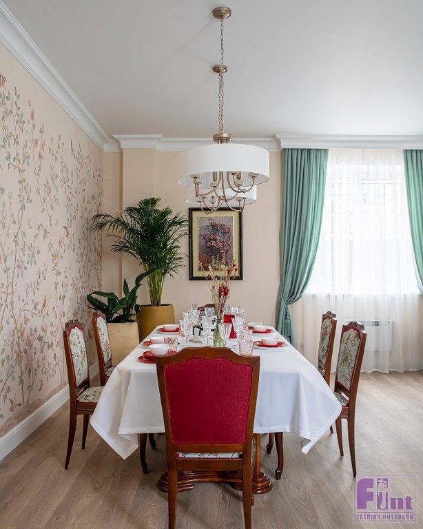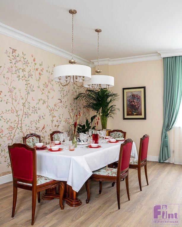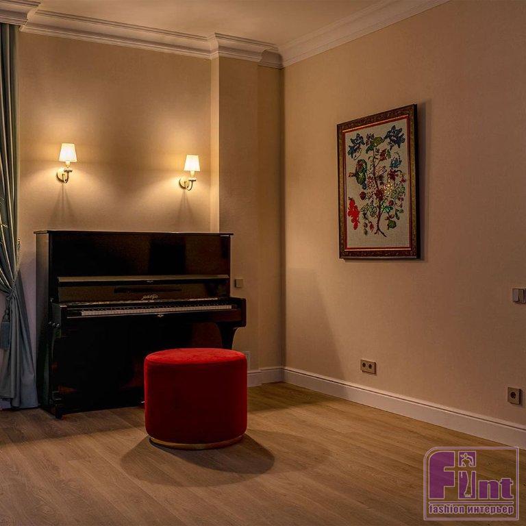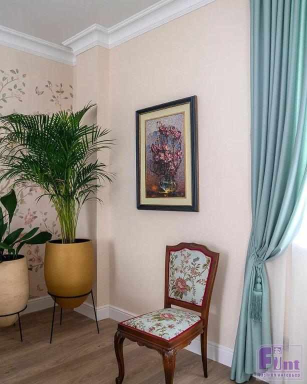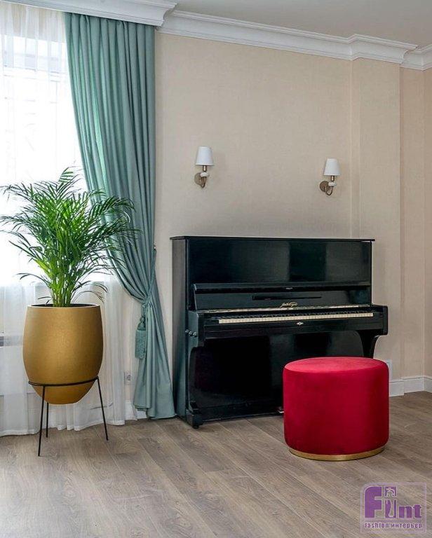 Гостиную для Тамары Михайловны и её семьи украсили люстрами в классическом стиле, модным зеркальным телевизором, уютными портьерами мятного цвета и неприхотливыми, но очень красивыми комнатными растениями. Старые стулья отреставрировали, покрыли лаком и обили новой тканью и декоративной тесьмой. Уюта комнате также добавил новый раскладной диван светлого цвета, который при необходимости может послужить полноценным спальным местом. Стильное кресло и пуфик, обитые итальянским бархатом и украшенные латунью, заняли своё место в музыкальной зоне гостиной.
