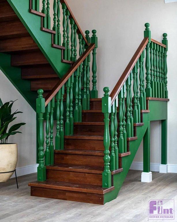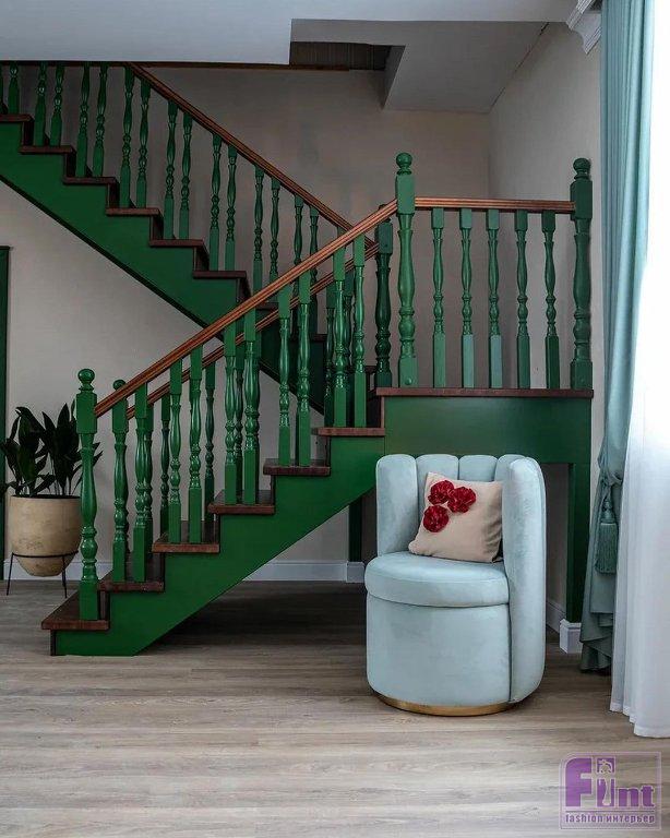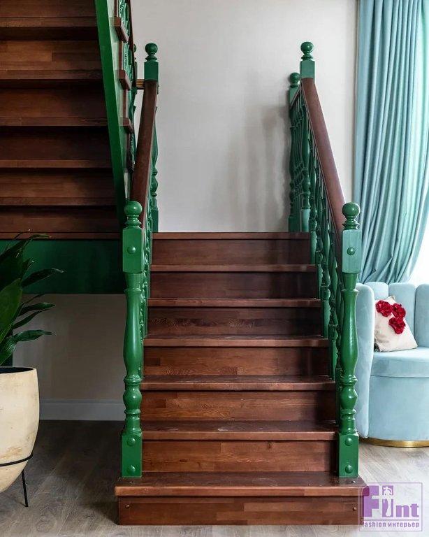 Старую лестницу также полностью демонтировали и собрали новую, более удобную, выполненную из трёх пород дерева: сосны, лиственницы и дуба. Кроме того, ширина ступеней рассчитывалась специально по ширине шага хозяек дома. Балясины, покрытые специальным защитным лаком и выкрашенные в тёмно-зеленый цвет, придают лестнице особую воздушность и красоту.