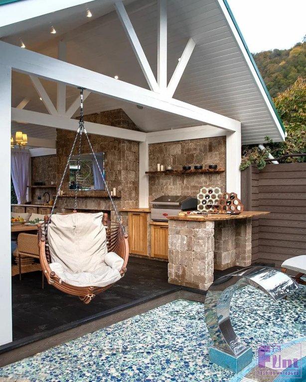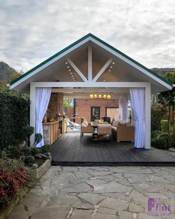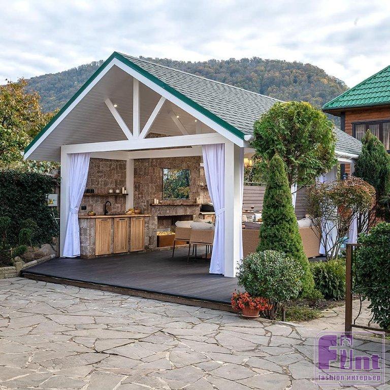 Главная идея проекта переделки – сделать пространство беседки уютным и функциональным. Переделка началась с демонтажа колонн, крыши, забора и каменной горки, расположившейся рядом. Задняя стенка беседки выполнена из искусственного камня, из этого же материала сделана ниша для камина и кухонного оборудования. Крышу выполнили из прочной фанеры и доски, высушенной специальным образом, и покрыли многослойной гибкой черепицей, а пол обустроили из террасной доски.