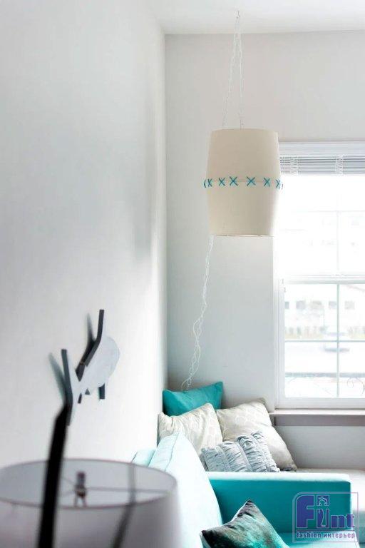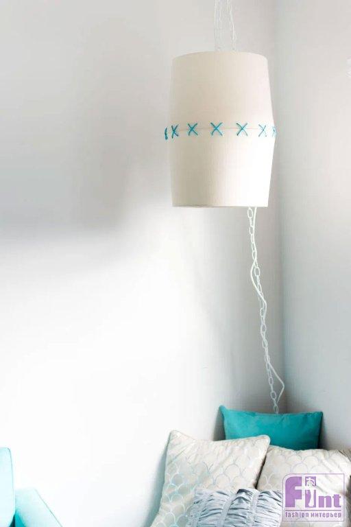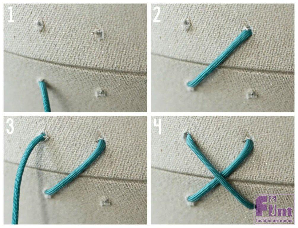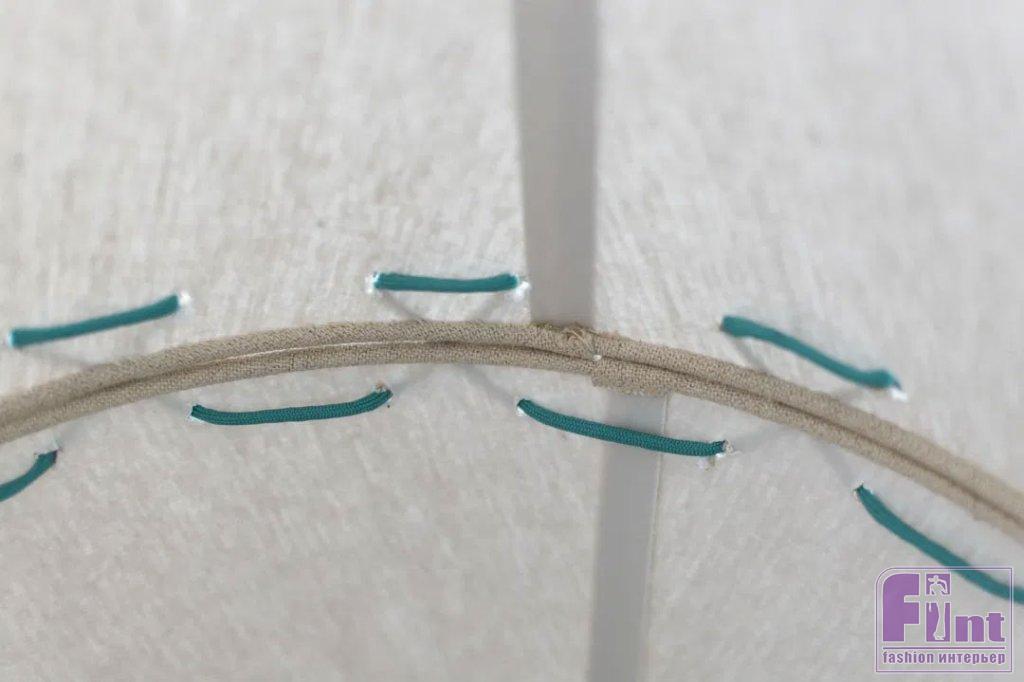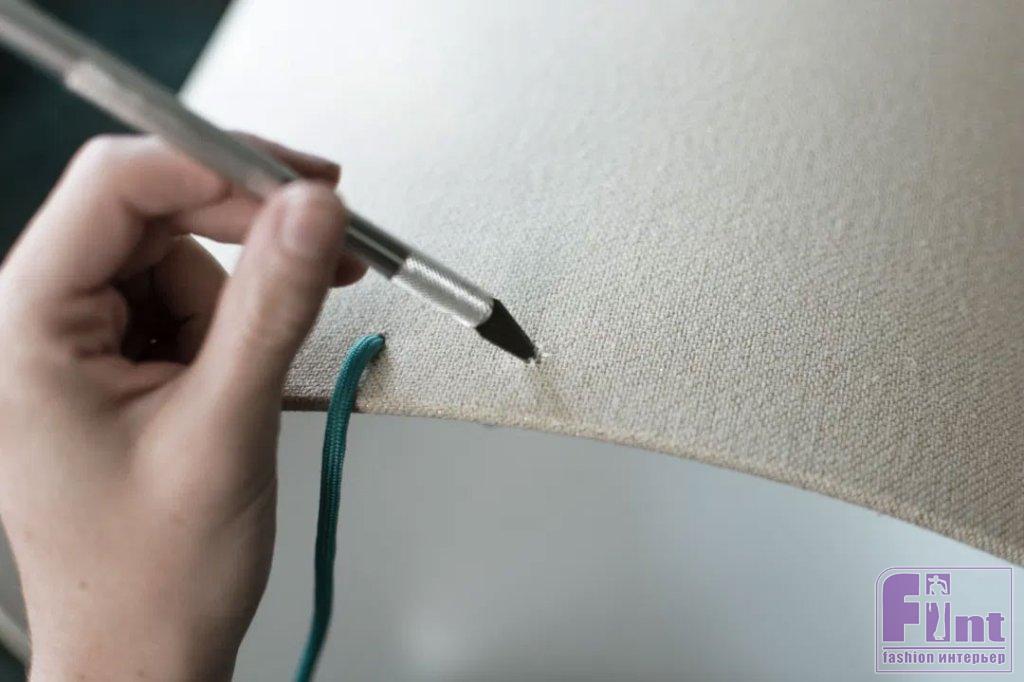 При помощи острого ножа с тонким лезвием аккуратно наметьте отверстия по диаметру абажура. Проявите максимальную аккуратность, чтобы не сильно прорезать ткань на абажурах. Как только отверстия будут сделаны, можно начинать процесс «сшивания». Используйте для соединения абажуров любой подходящий шнур. Мы выбрали тонкий паракорд яркого бирюзового цвета, контрастного по отношению к цвету ткани абажуров. Сшейте абажуры крестообразными стежками, попеременно продевая шнур в отверстия на нижнем и верхнем абажуре. Завершите сшивание, завязав узел на шнуре с обратной стороны абажура.